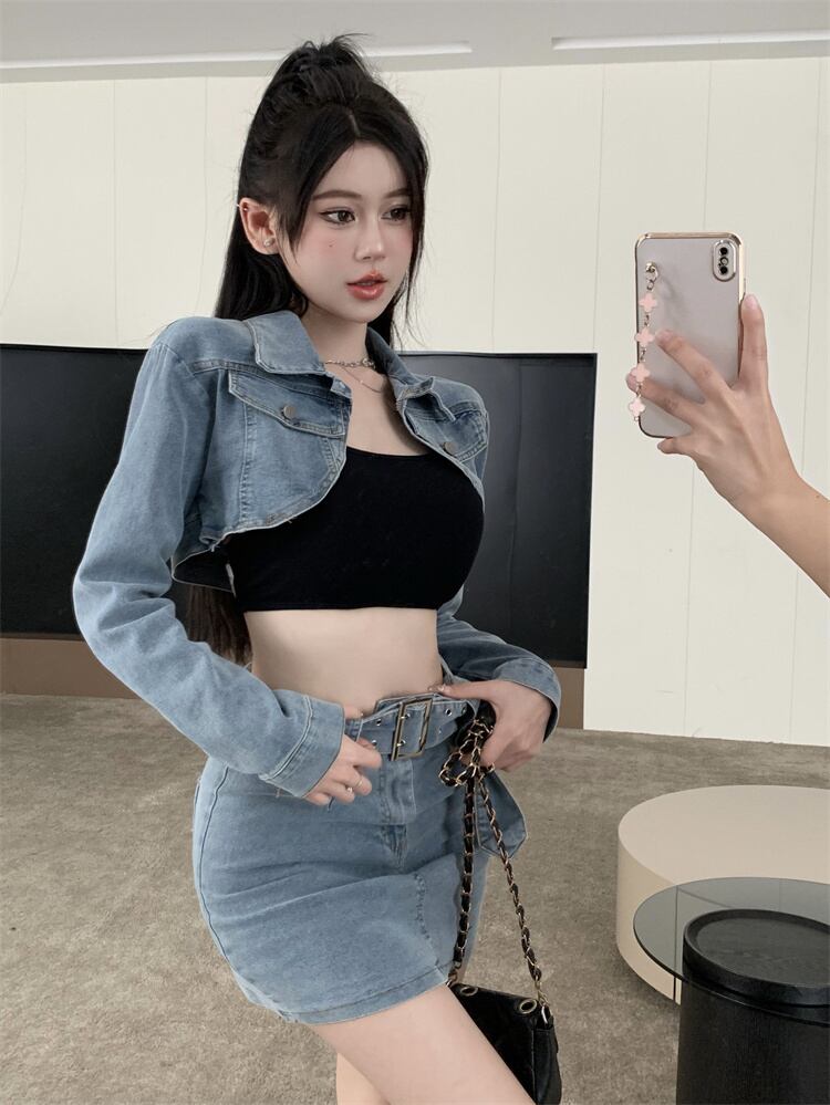 甘くてクールホットガールシックスーツ秋超ショートデニムコートセクシーウエストミニスカートツーピースセット服 大人ガーリー スウィート キュート カジュアル オータム 秋物