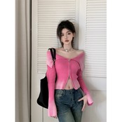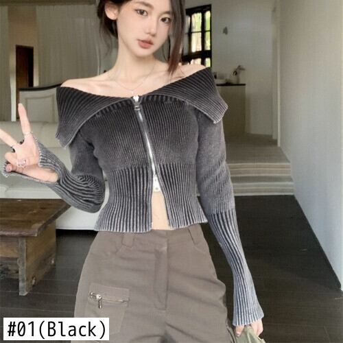 ホットガールレトロ段階的スプライスニット秋ダブルヘッドジップターンダウン襟ショートオフショルダー長袖カーディガン ロング オータム 秋物