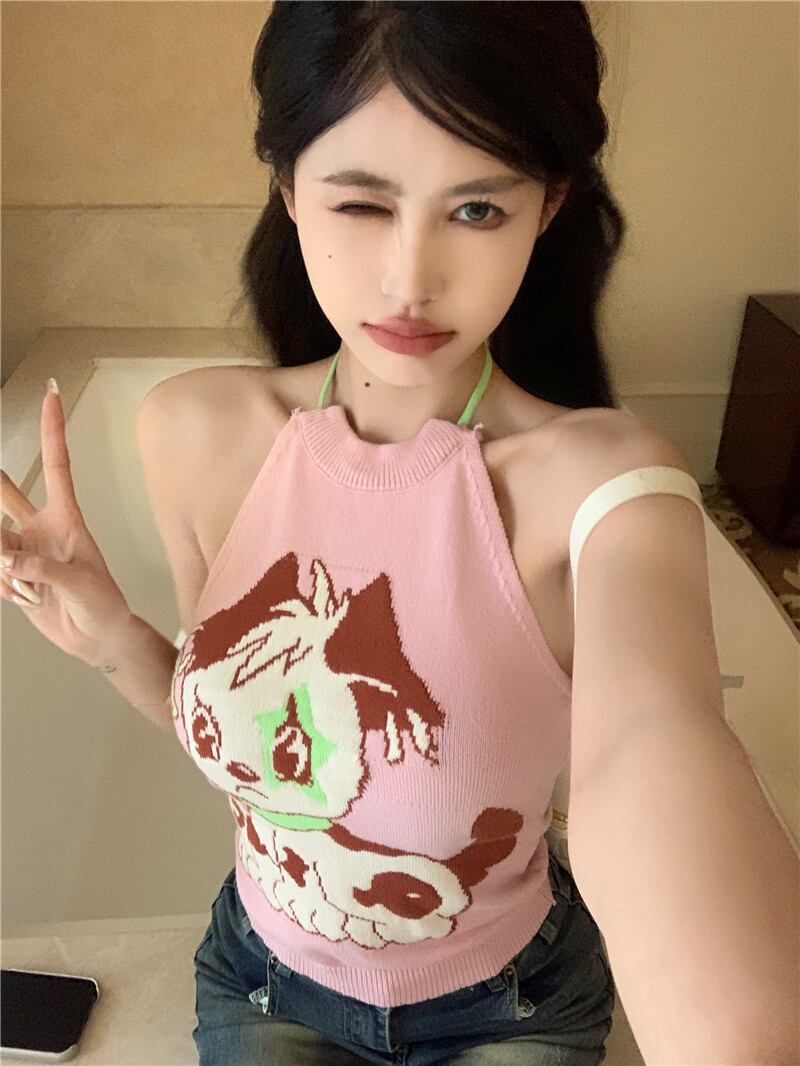 甘いホットガールピンクニット子犬タンクトップ夏ネックホルターオープンバックスリムフィットニット服 大人ガーリー スウィート キュート カジュアル サマー 夏物