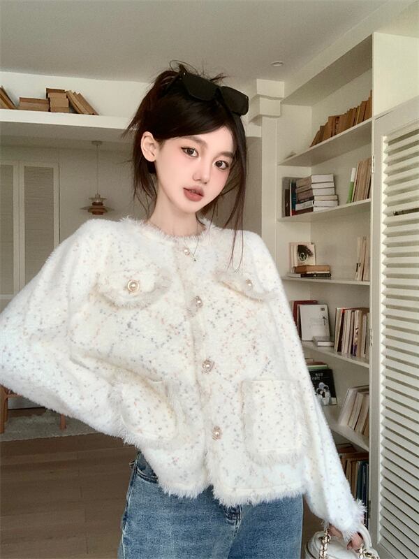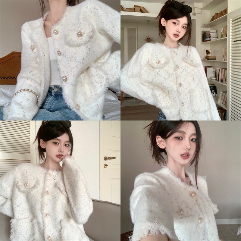 オフィスレディ通勤テルコート秋イミテーションミンクフリースラウンドネック長袖カーディガン服 ロング オータム 秋物 Oネック 会社 学校 通勤や通学にも