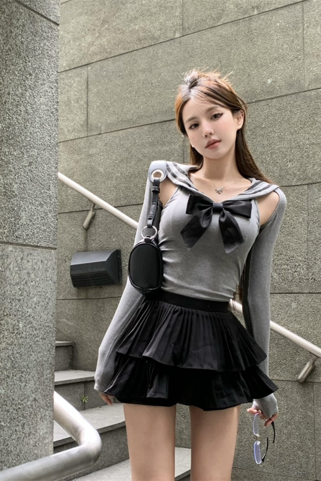 ホットガールプレッピースタイルスーツ夏弓セーラー襟スリムフィットトップウエストブラックケーキショートスカートツーピースセット リボン サマー 夏物