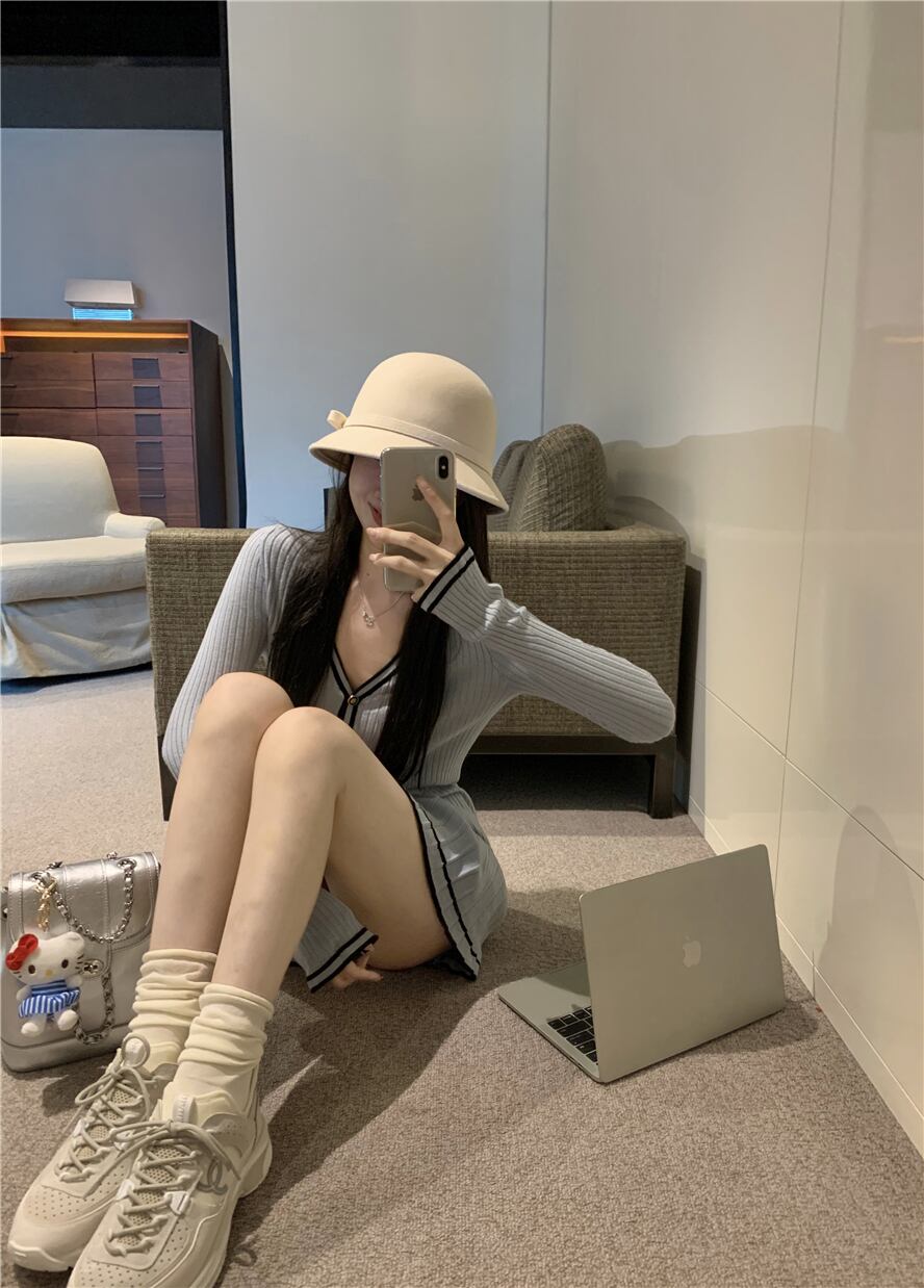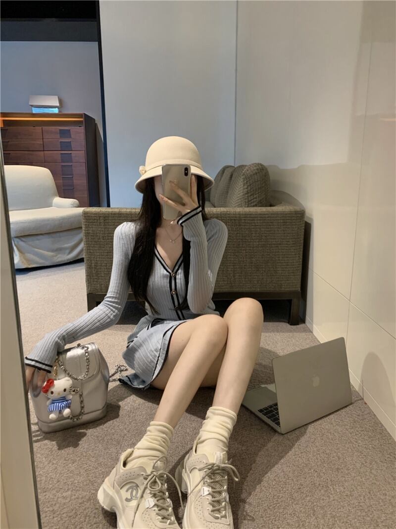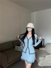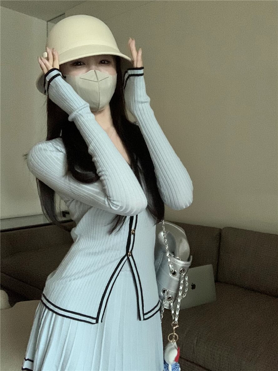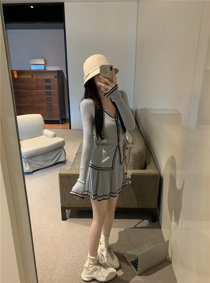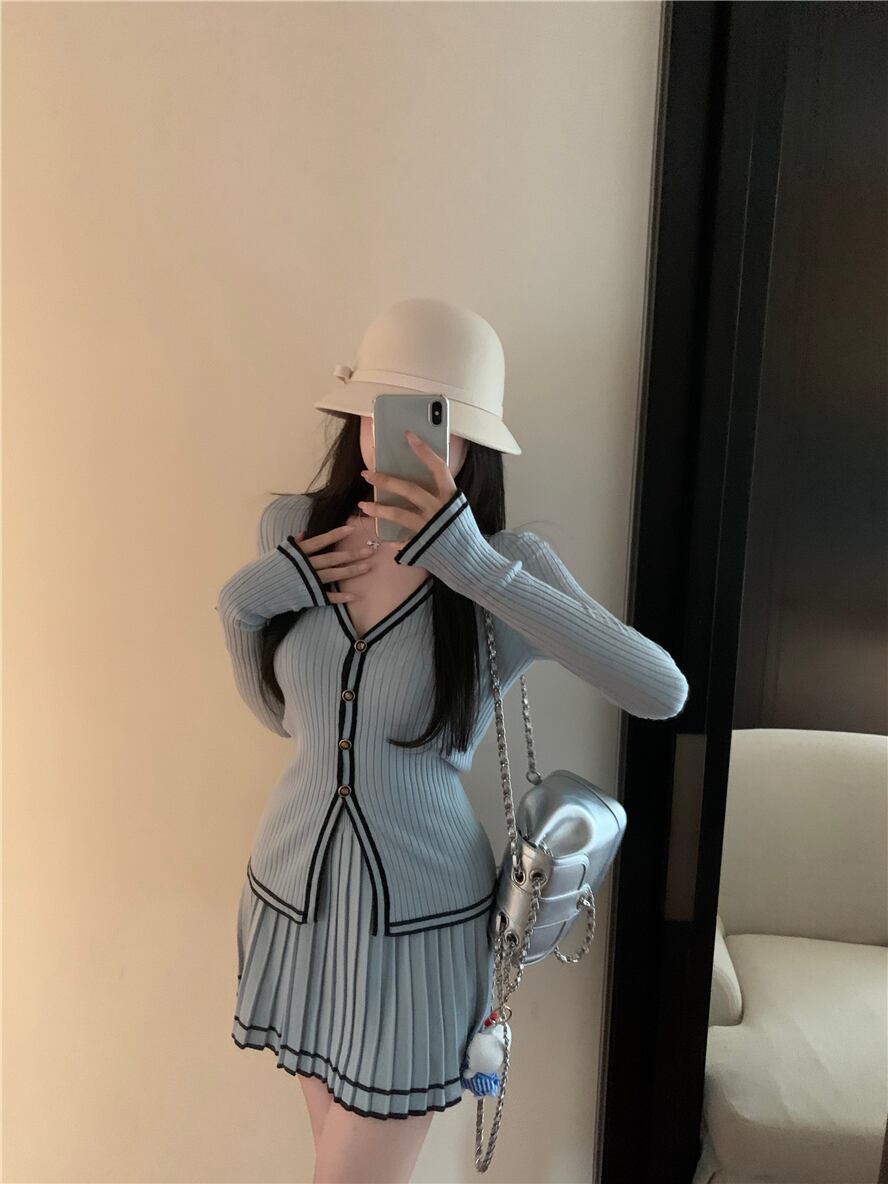 ホットガール純粋セクシースーツ夏長袖スリムフィットニットカーディガンプリーツミニスカートツーピースセット服 ロング サマー 夏物 ピュア