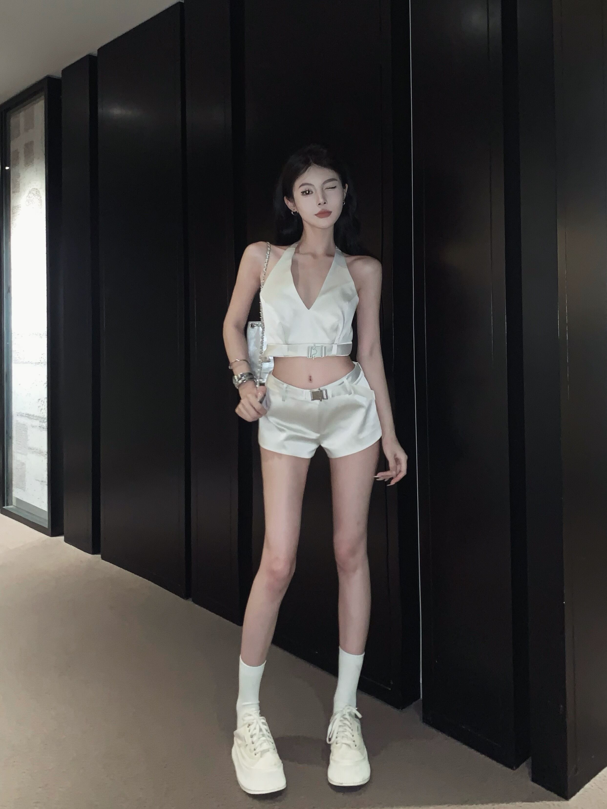 スイートクールガールスーツ夏 V ネックショートホルターネックストラップトップローウエストショーツファッション 2 点セット 大人ガーリー スウィート キュート カジュアル サマー 夏物 ブルマー Vネック