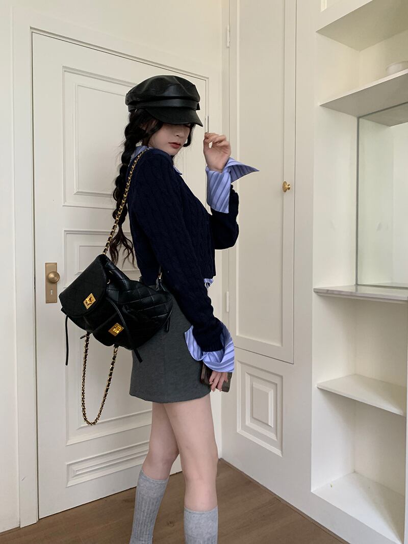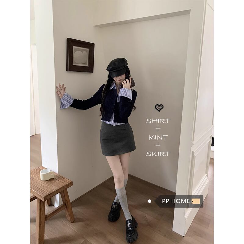 スタイルスーツ夏ニットカーディガンストライプシャツラップヒップショートスカート 3 点セット服 サマー 夏物