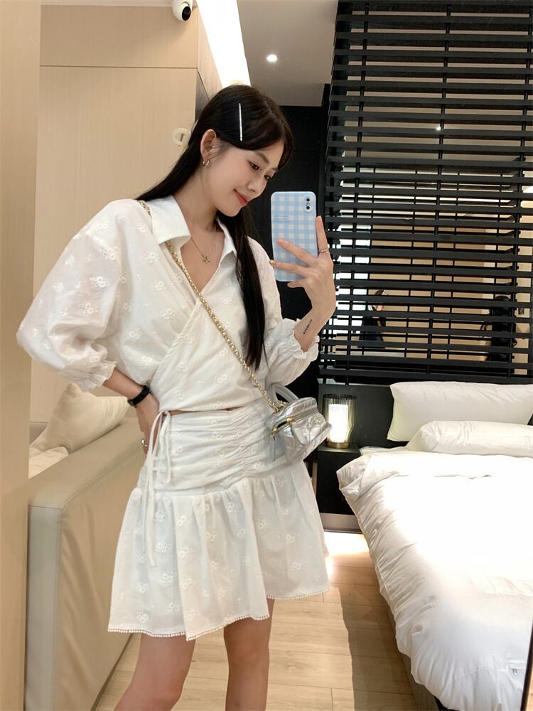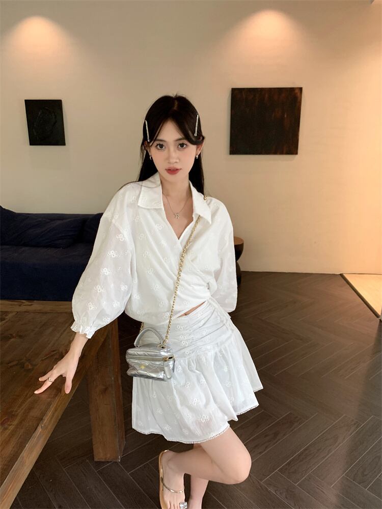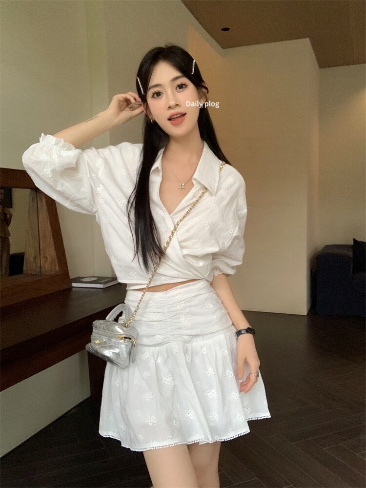 甘いホットガールスーツ夏 V ネック白半袖シャツウエストショートスカート 2 点セット服 ホワイト ハーフスリーブ 大人ガーリー スウィート キュート カジュアル サマー 夏物 Vネック