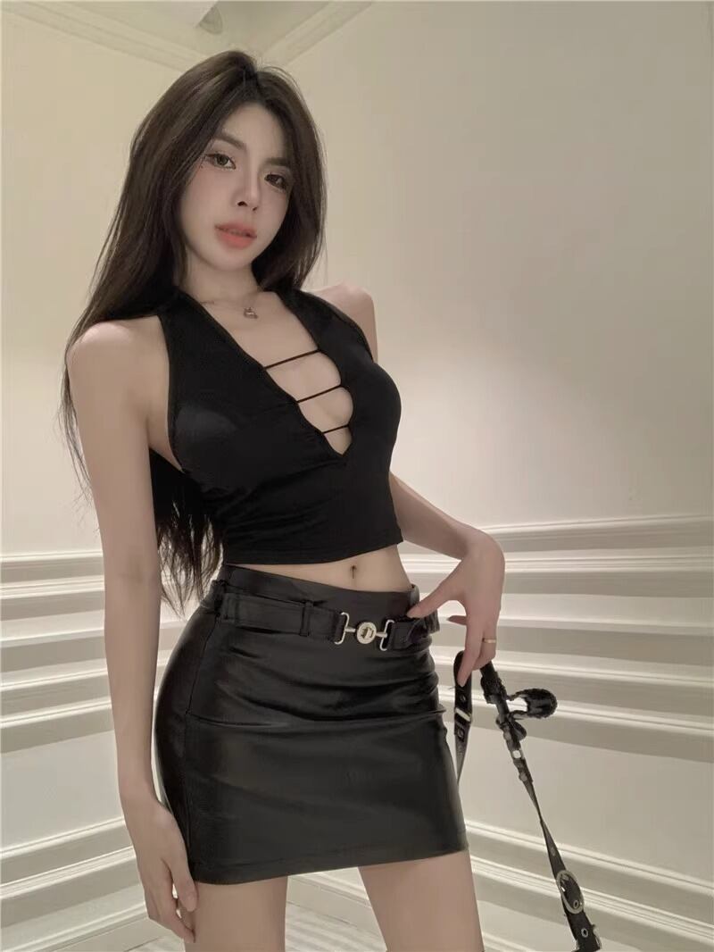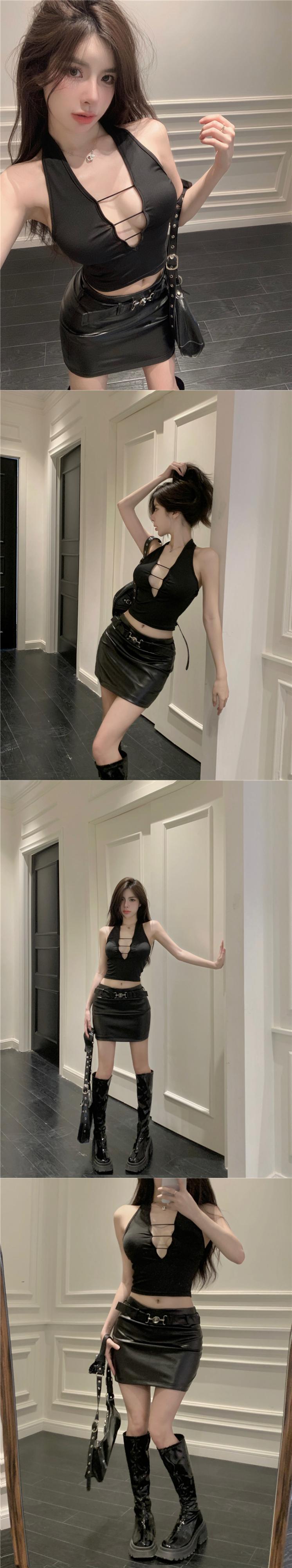 ホットガールズセクシースーツ夏ディープ V 中空ホルター背中開いた弾性ストラップトップウエストベルトレザースカート 2 点セット エラスティック 伸縮 サマー 夏物 ハーネス