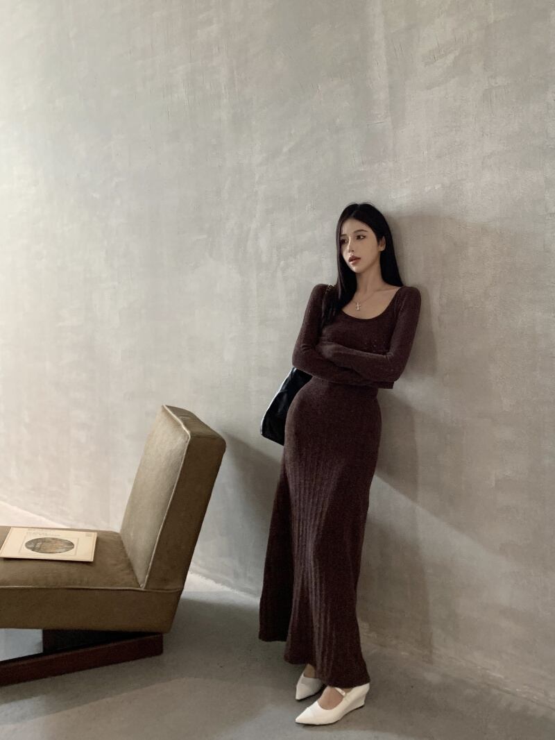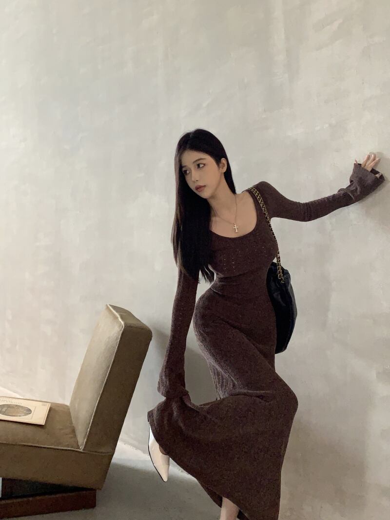 スタイルセクシーホットガールドレス秋 O ネック長袖ニットスリムフィットロングドレス服 オータム 秋物 Oネック