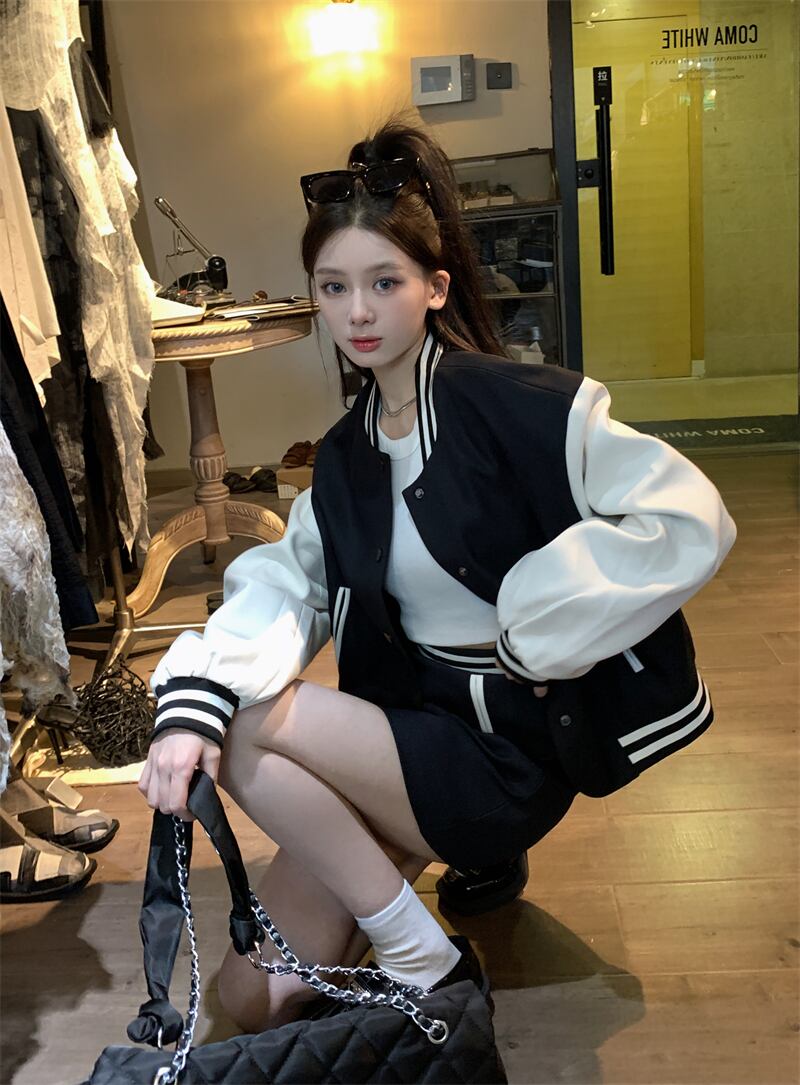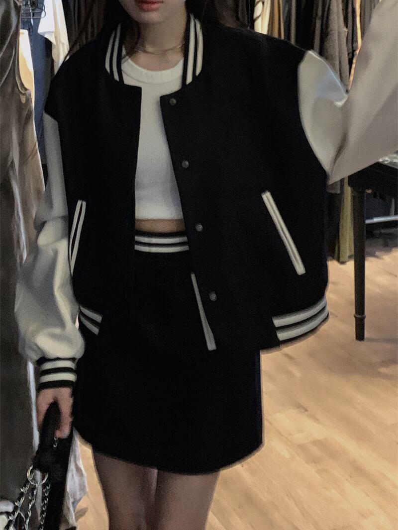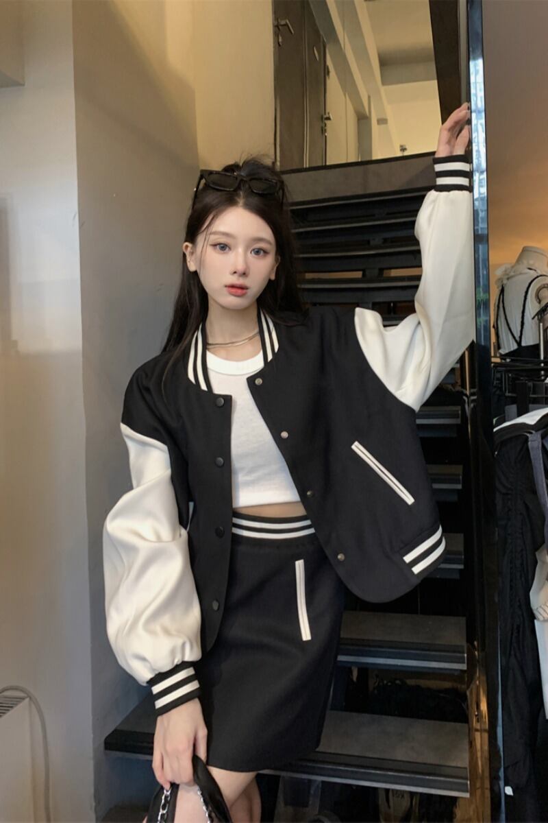 アメリカンレトロ BF スタイルスーツ春長袖野球ジャケットウエストスカート 2 点セット服 ロング スプリング 春物