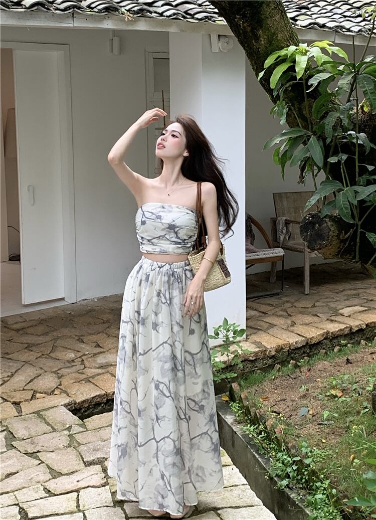 ホットガールレトロスーツ夏インクプリントストラップレスベストウエストミッドレングススカートツーピースセット服 サマー 夏物