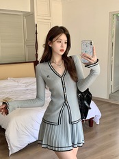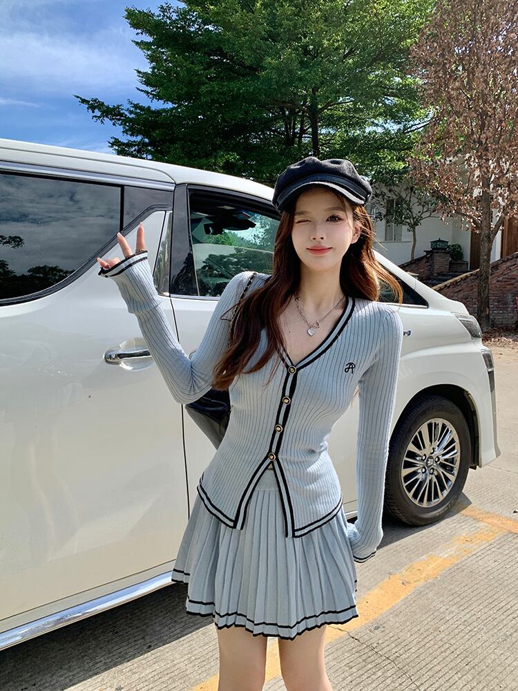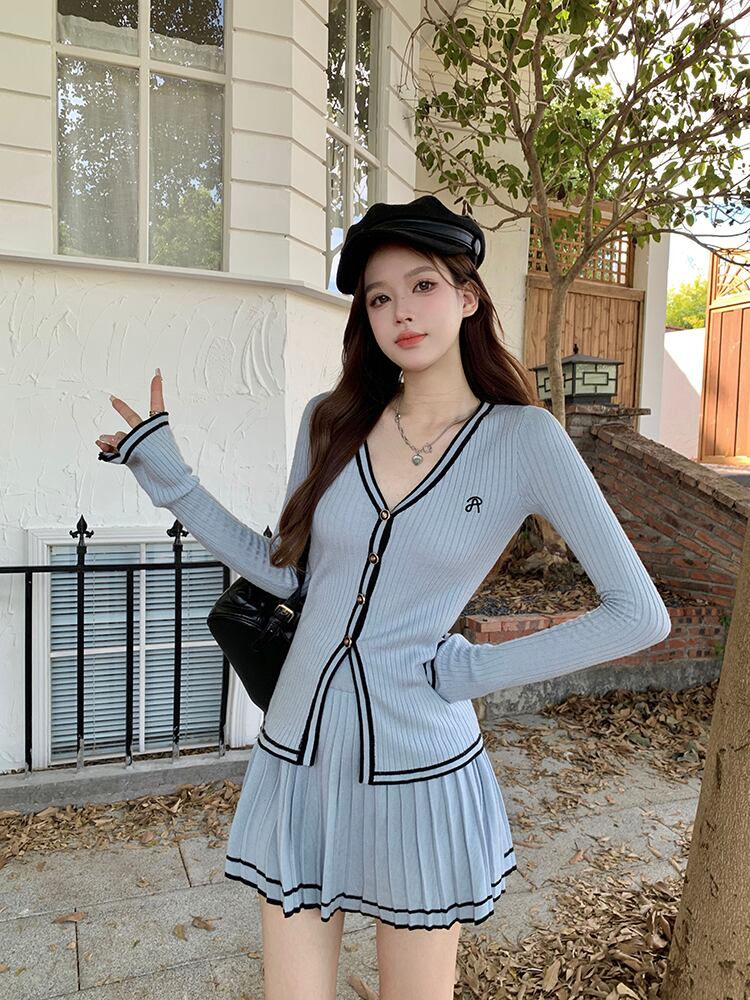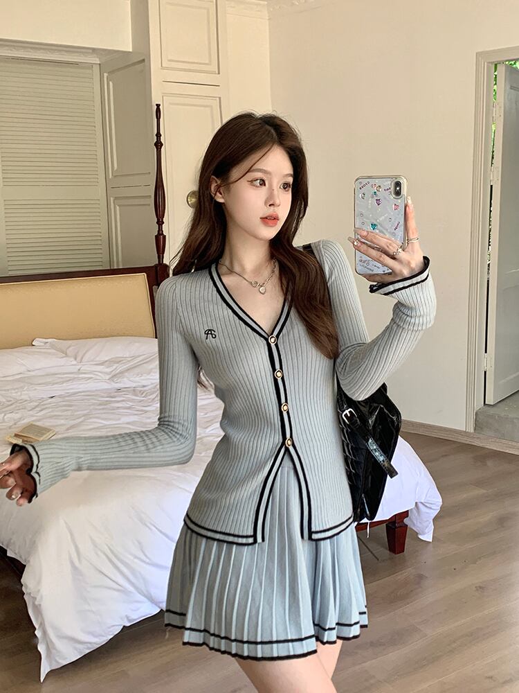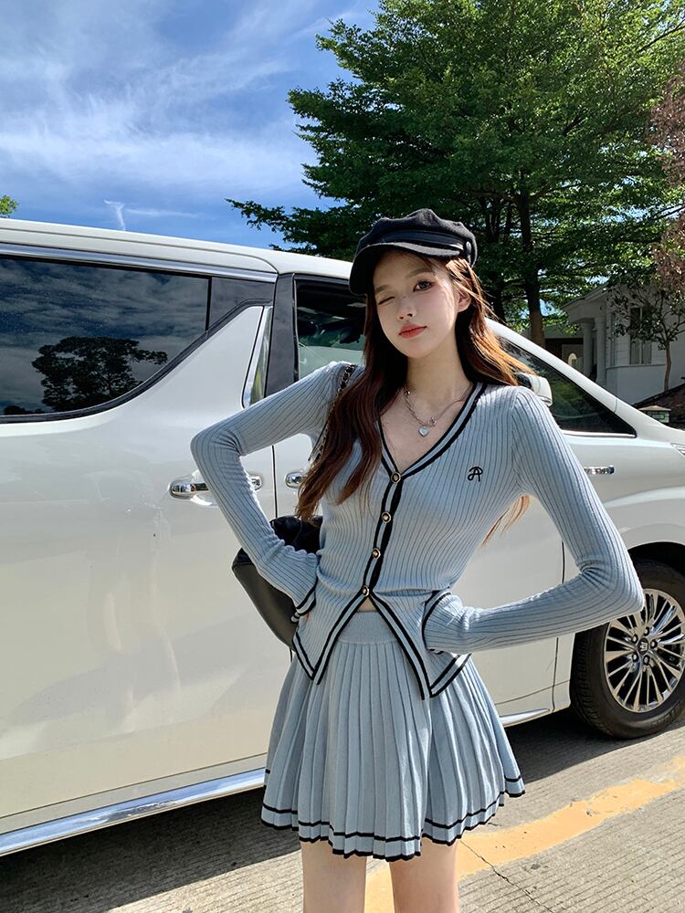 甘いホットガールスーツ秋ボタン長袖ニットカーディガン A ラインショートスカート 2 点セット服 ロング 大人ガーリー スウィート キュート カジュアル オータム 秋物 Aライン