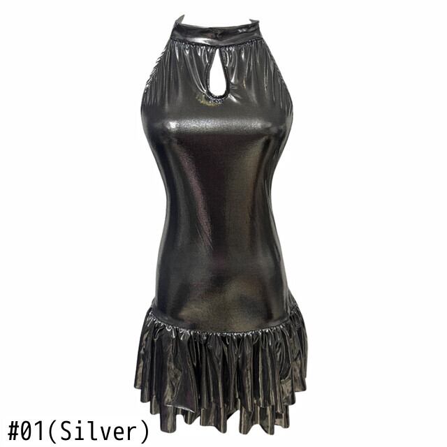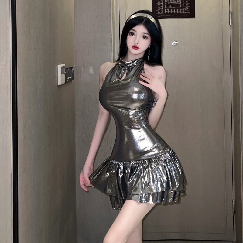 甘いホットガールシルバーノースリーブフリルエッジスリムフィットドレス夏セクシー背中開いた A ラインドレス服 大人ガーリー スウィート キュート カジュアル サマー 夏物 Aライン 銀
