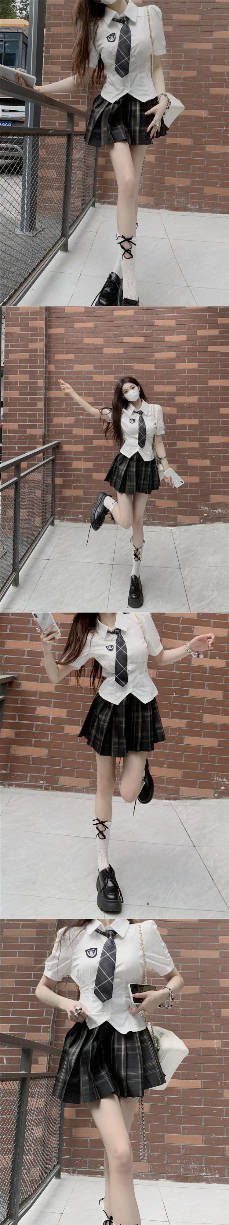 スタイルスーツ夏スリムフィット半袖シャツトップチェック柄プリーツミニスカート 2 点セット服 サマー 夏物