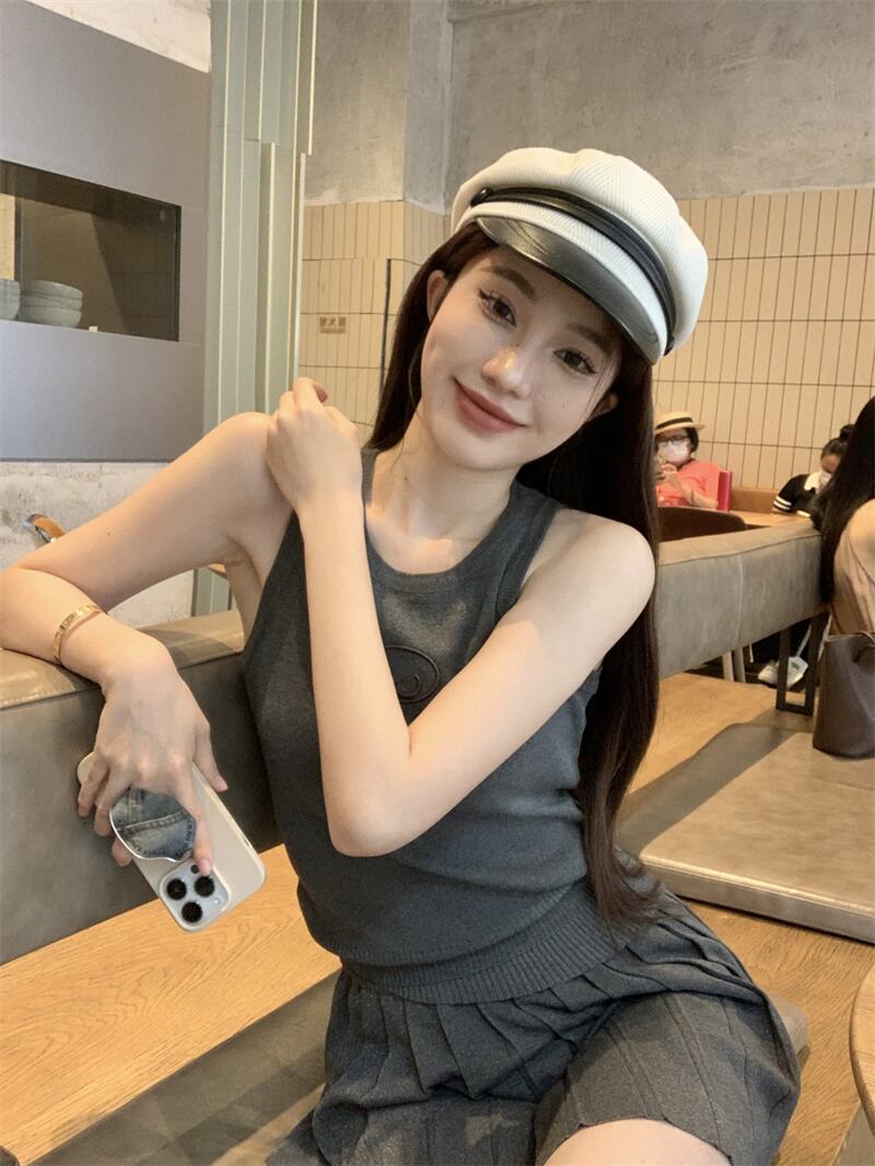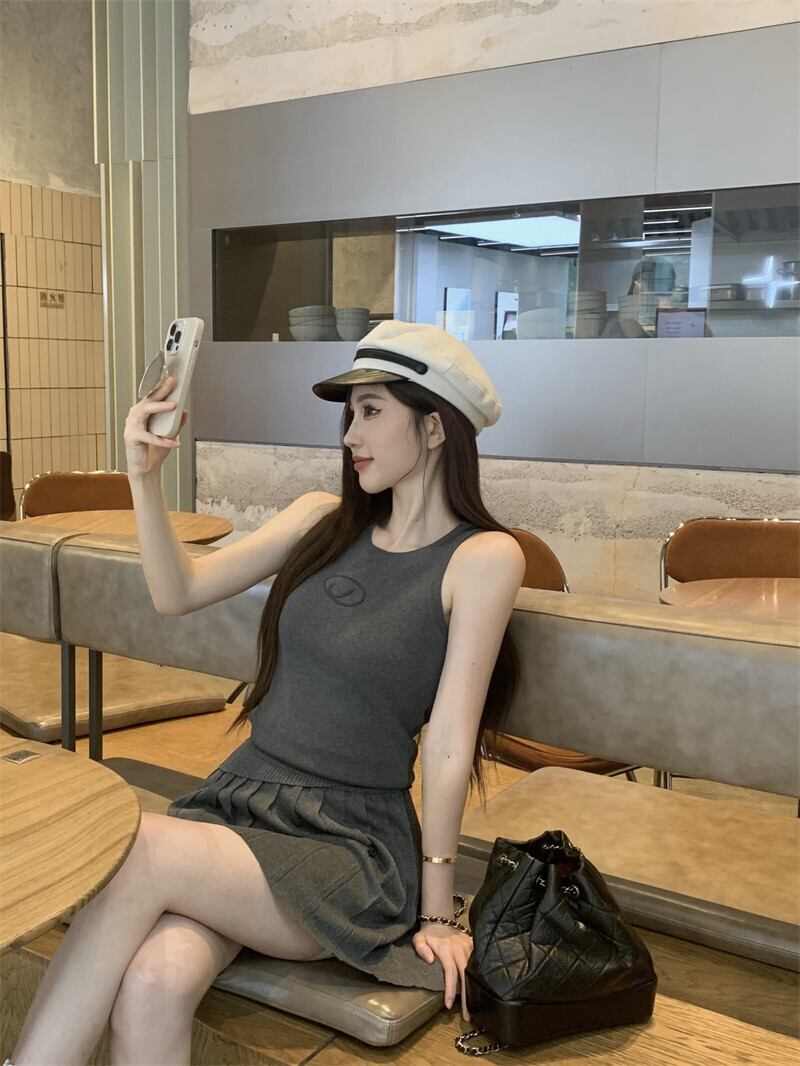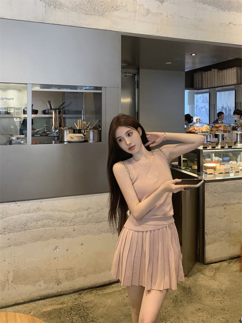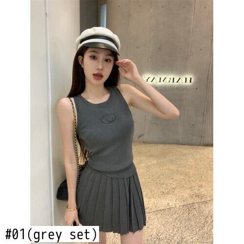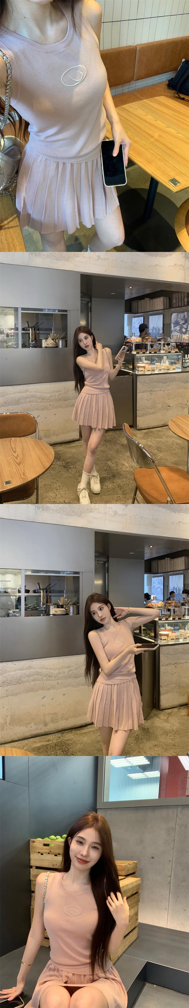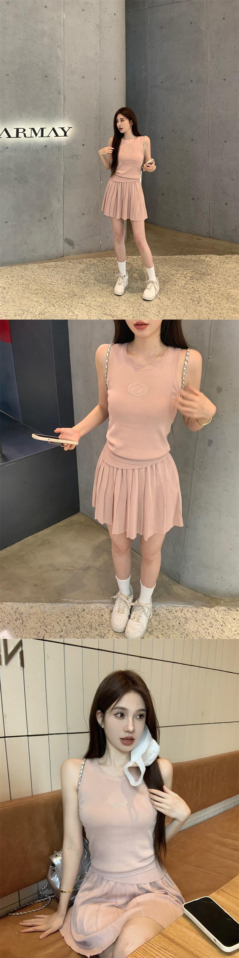 ホットガールスーツ夏刺繍ニットノースリーブタンクトップウエストプリーツスカート 2 点セット服 サマー 夏物