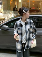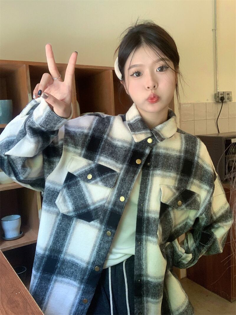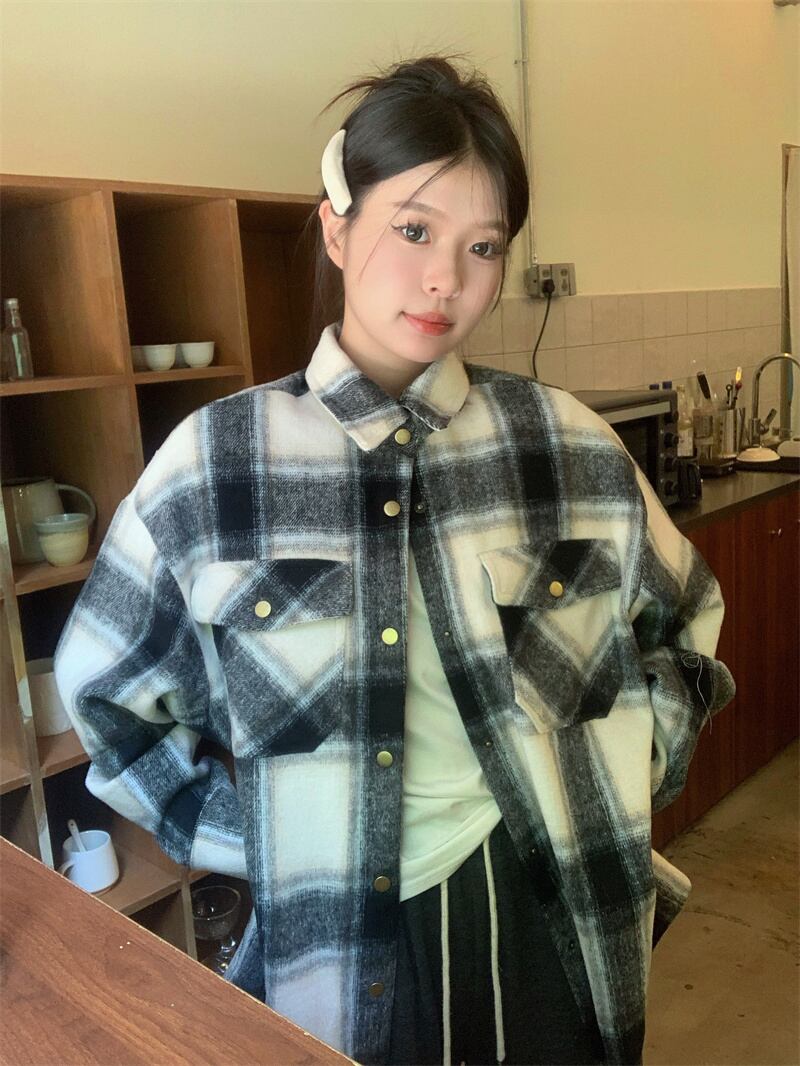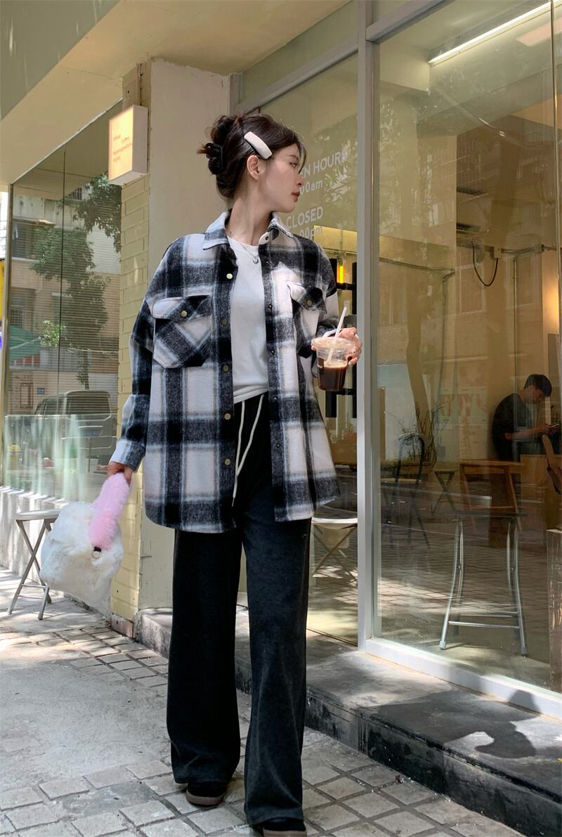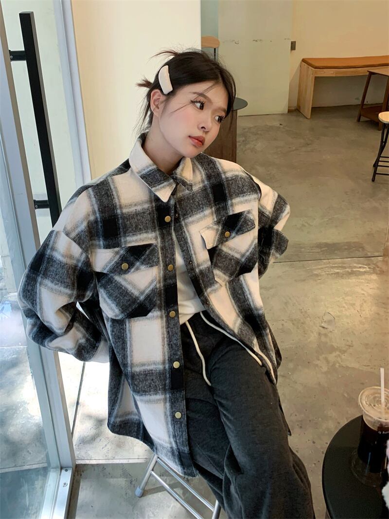 アメリカンチェック柄長袖ポロネックシャツコートレディース初秋ミッドレングスシャツBFトップ ロング オータム 秋物