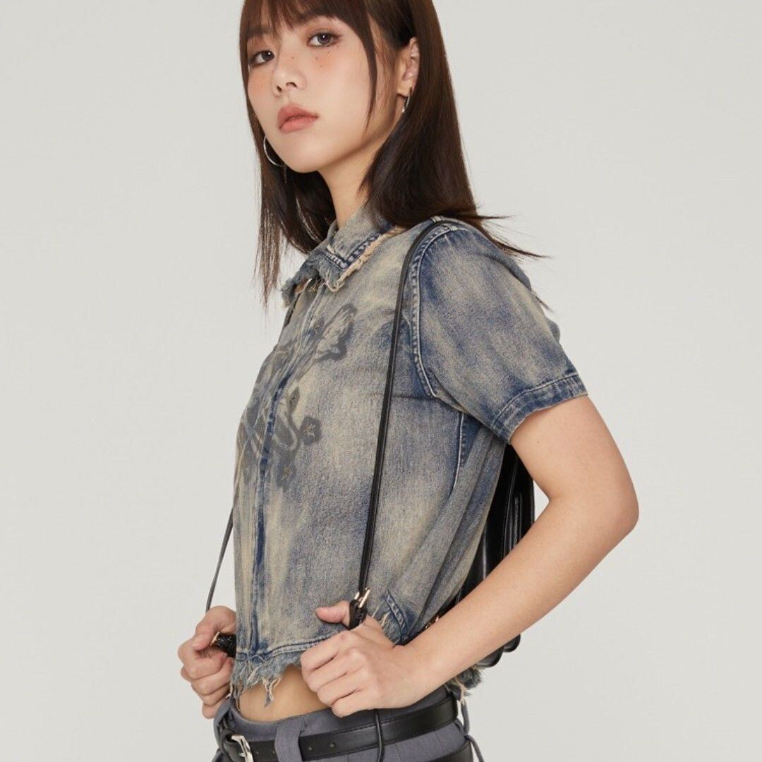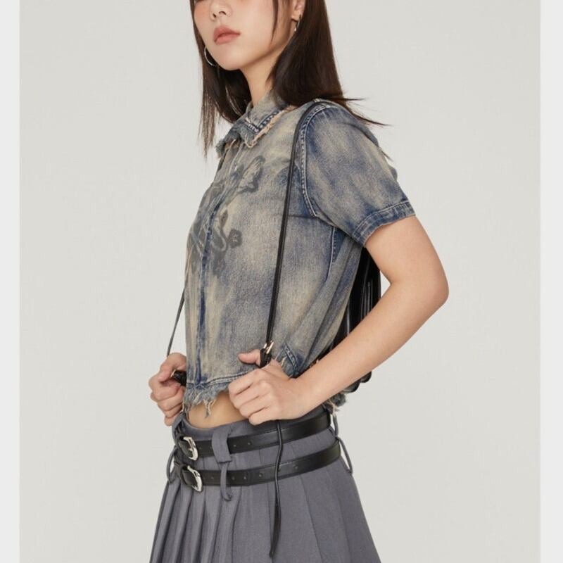 スパイシーガールオフショルダーデニムプリント半袖TシャツサマーウォッシュTシャツラグエッジショートトップコート ハーフスリーブ 夏物