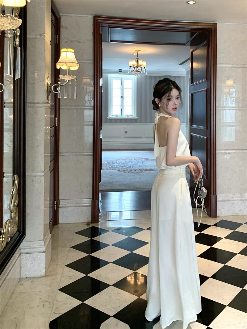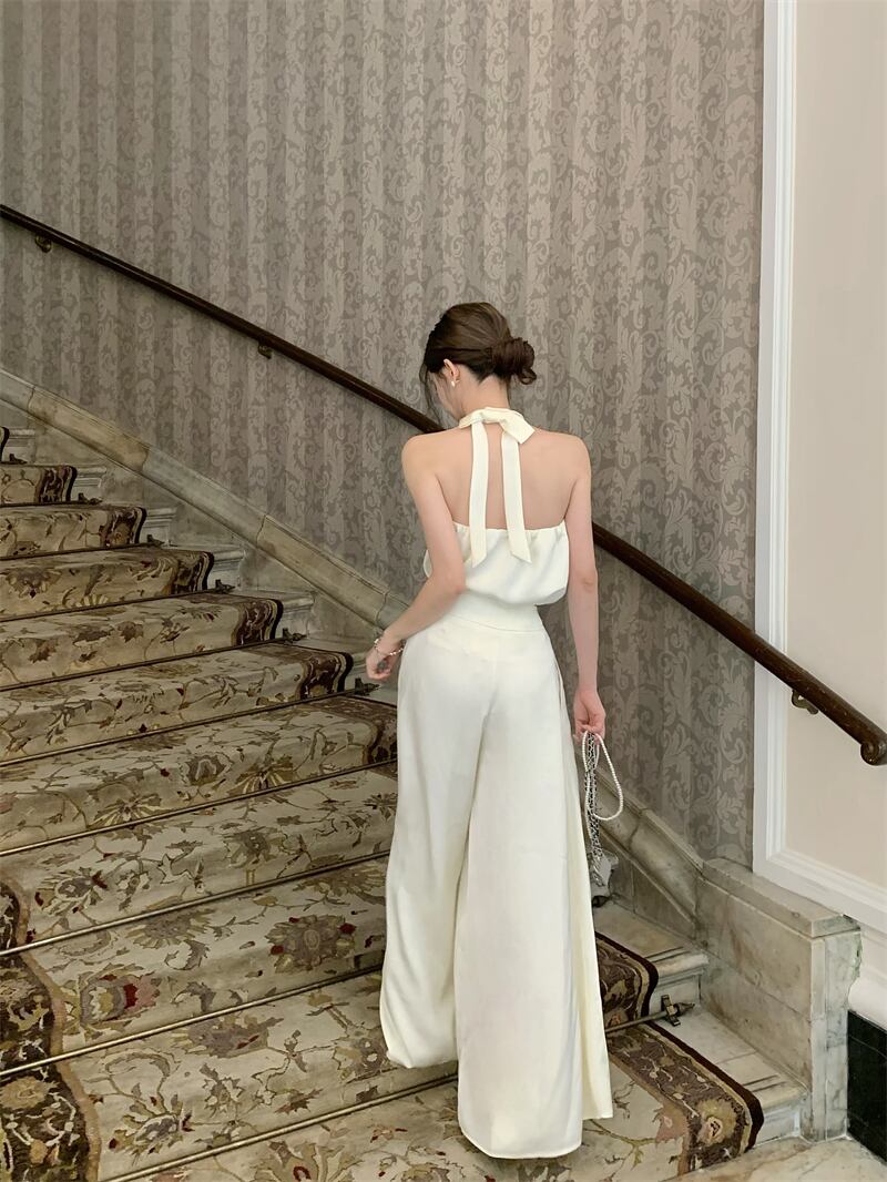 フランスオフィスレディ通勤スーツ夏ホルターネックタンクトップウエストワイド脚パンツ 2 点セット服 サマー 夏物 ワイドレッグ ワイドパンツ 会社 学校 通勤や通学にも