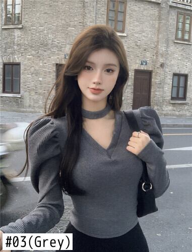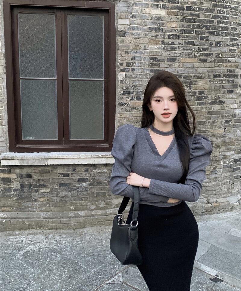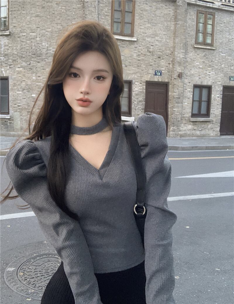 バブル袖秋グレー V ネック ニット プルオーバー レディース。スリムフィットショートスタイル、ボトムハンギングネックトップ オータム 秋物 Vネック