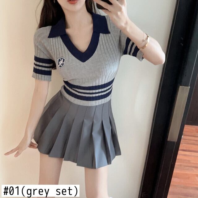 スタイルスーツ夏コントラストショートニットシャツウエストプリーツスカートツーピースセット服 サマー 夏物