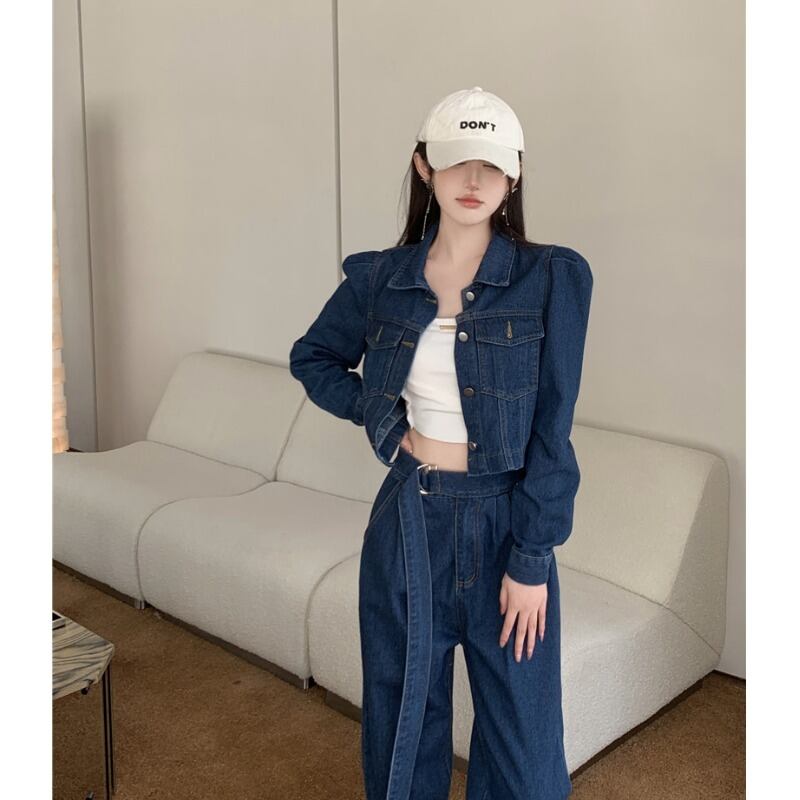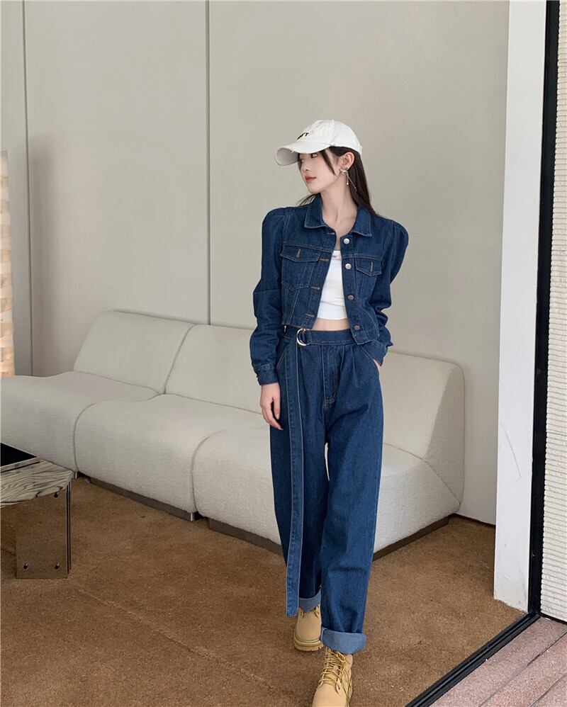 オフィスレディレトロスーツ秋バブルスリーブコートウエストロングジーンズ 2 点セット服 オータム 秋物 会社 学校 通勤や通学にも