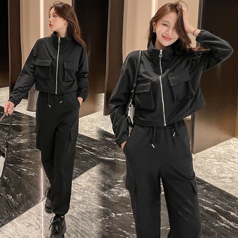 春と秋香港スタイルスポーツスーツカーディガンセーターウエストカーゴズボン 2 点セット スプリング 春物 オータム 秋物