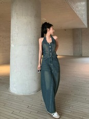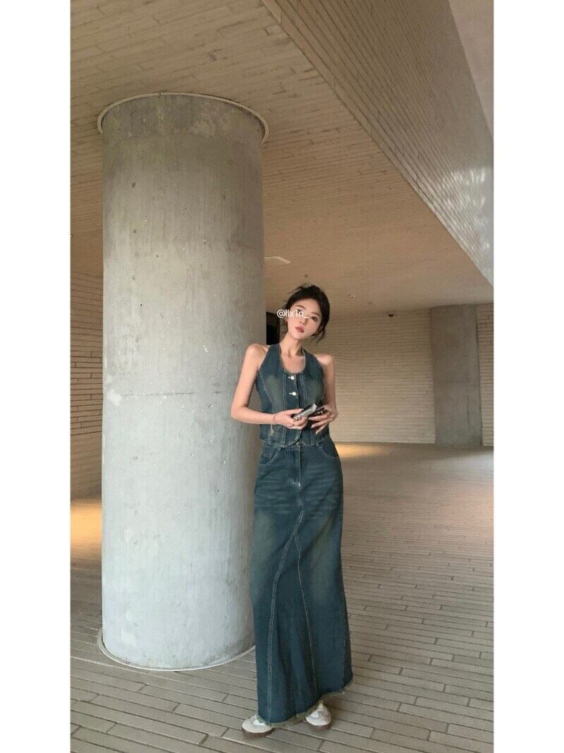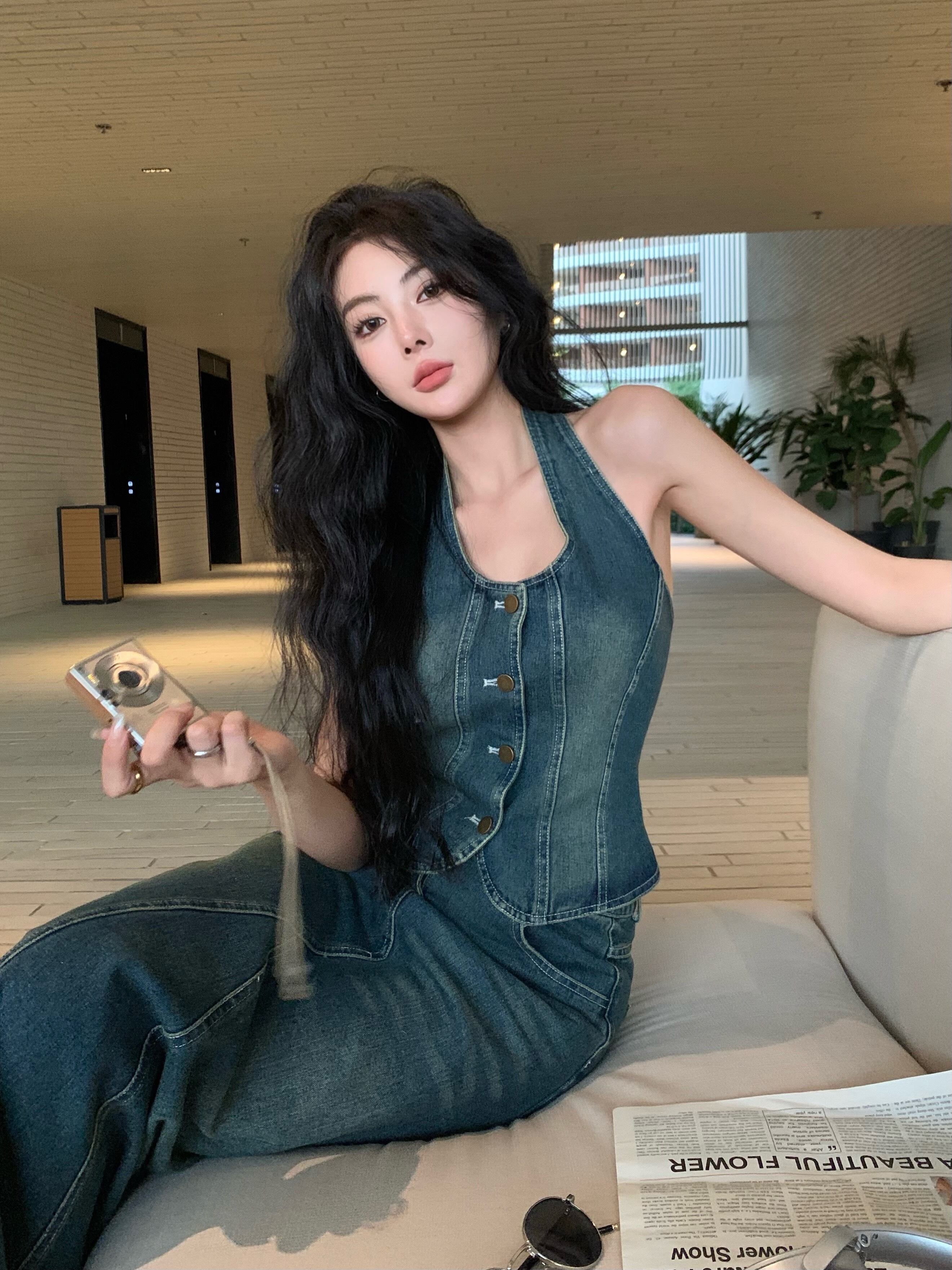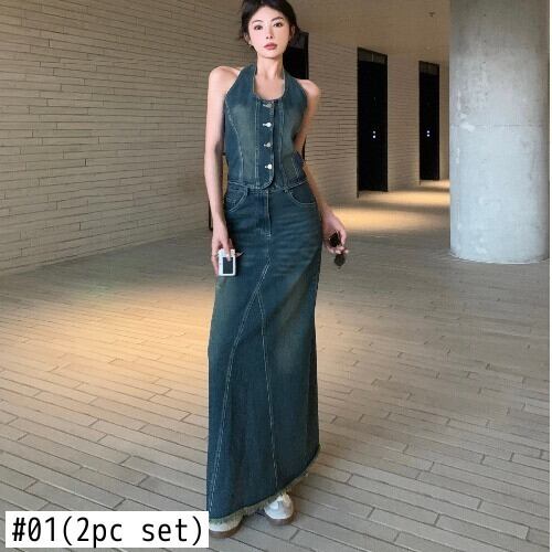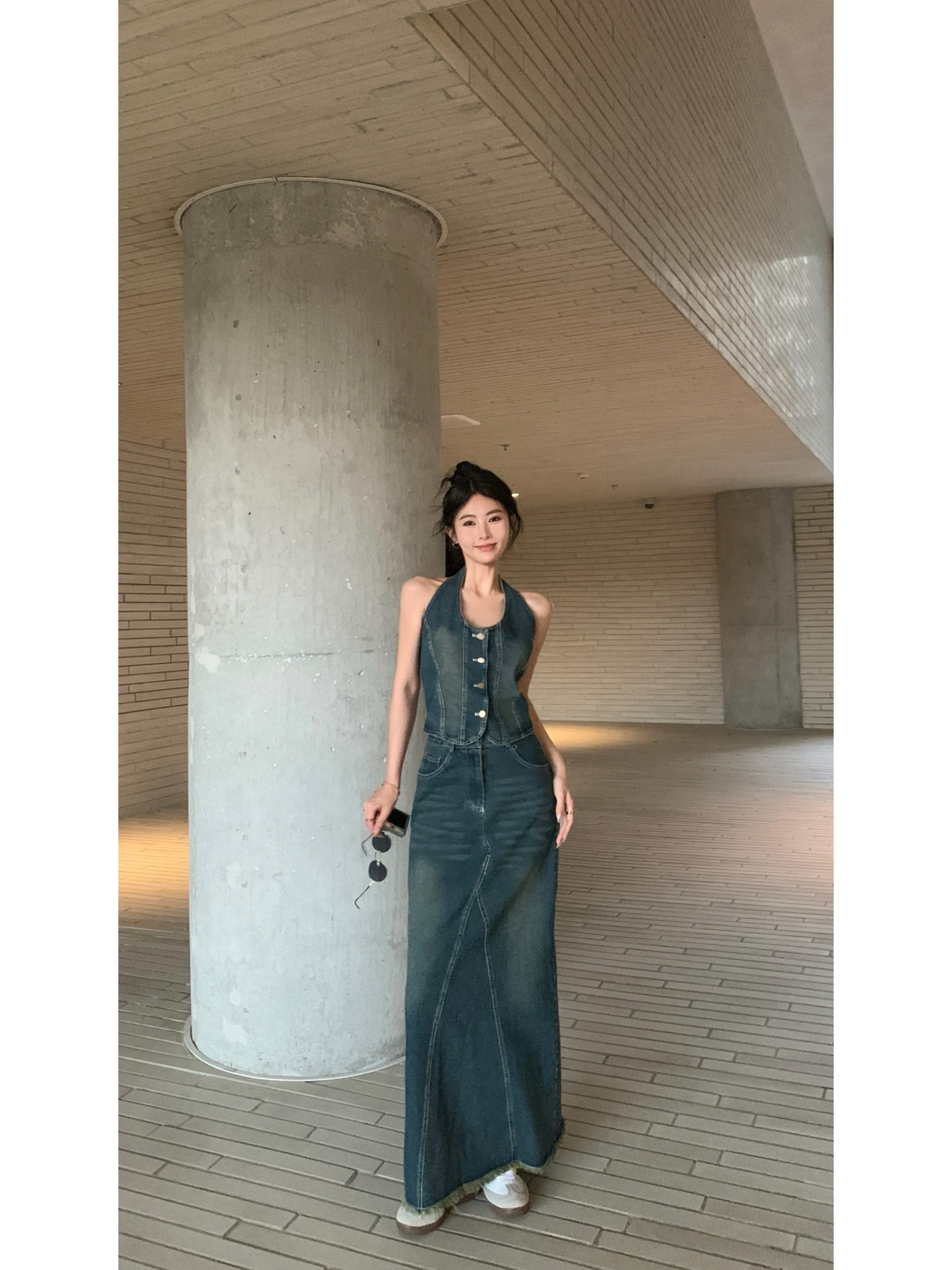 ホットガールズセクシー香港スタイルレトロスーツ夏デニムシンプルホルターネックタンクトップウエストロングスカート 2 点セット サマー 夏物