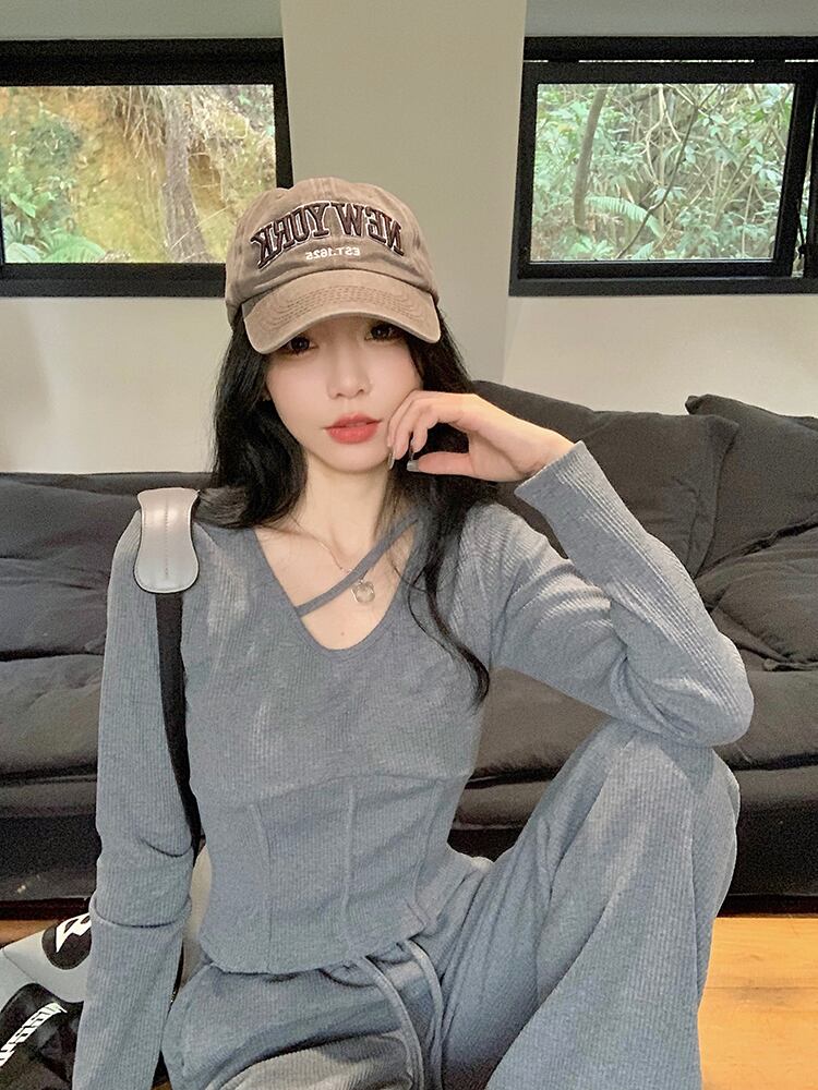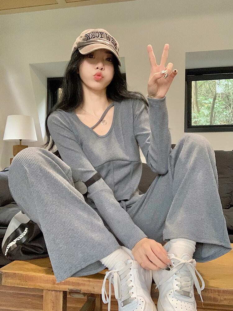 ホットガールスーツ秋 V ネック長袖 Tシャツトップウエストロングパンツ 2 点セット服 オータム 秋物 Vネック