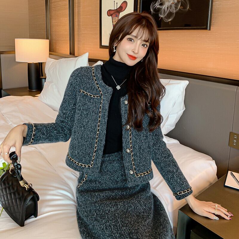 オフィスレディ スーツ レディース 秋冬 長袖 ラウンドネック コート ウエスト Aライン ロングスカート 2点セット オータム 秋物 ウィンター 冬物 Oネック 会社 学校 通勤や通学にも