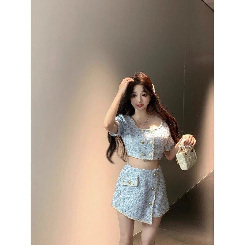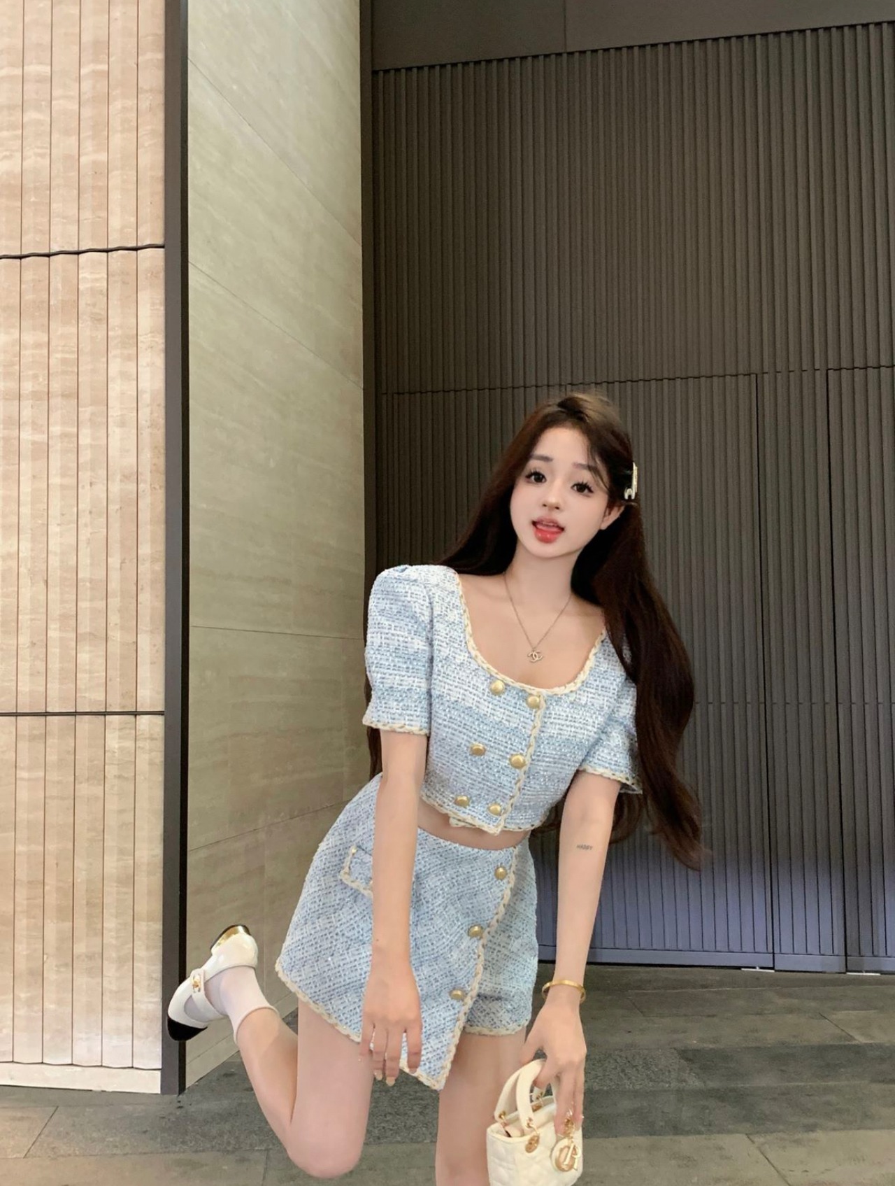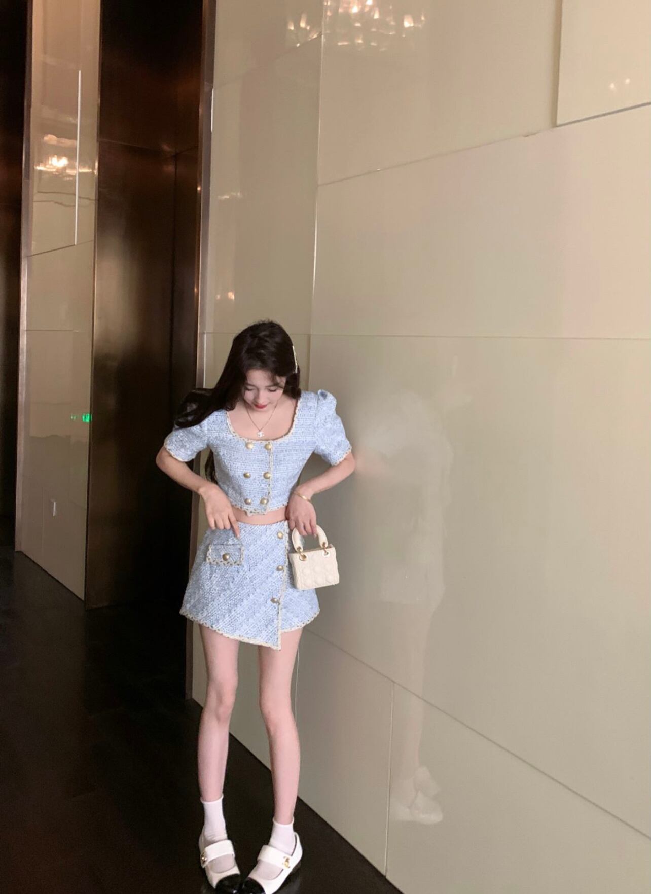 フランスオフィスレディブルースーツ夏スクエアカラーダブルブレストコートウエストミニスカート 2 点セット服 サマー 夏物 スクウェア 会社 学校 通勤や通学にも