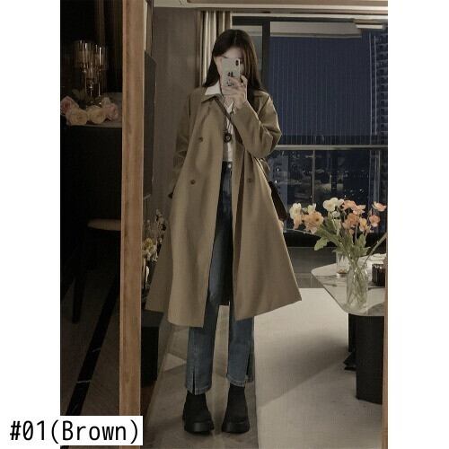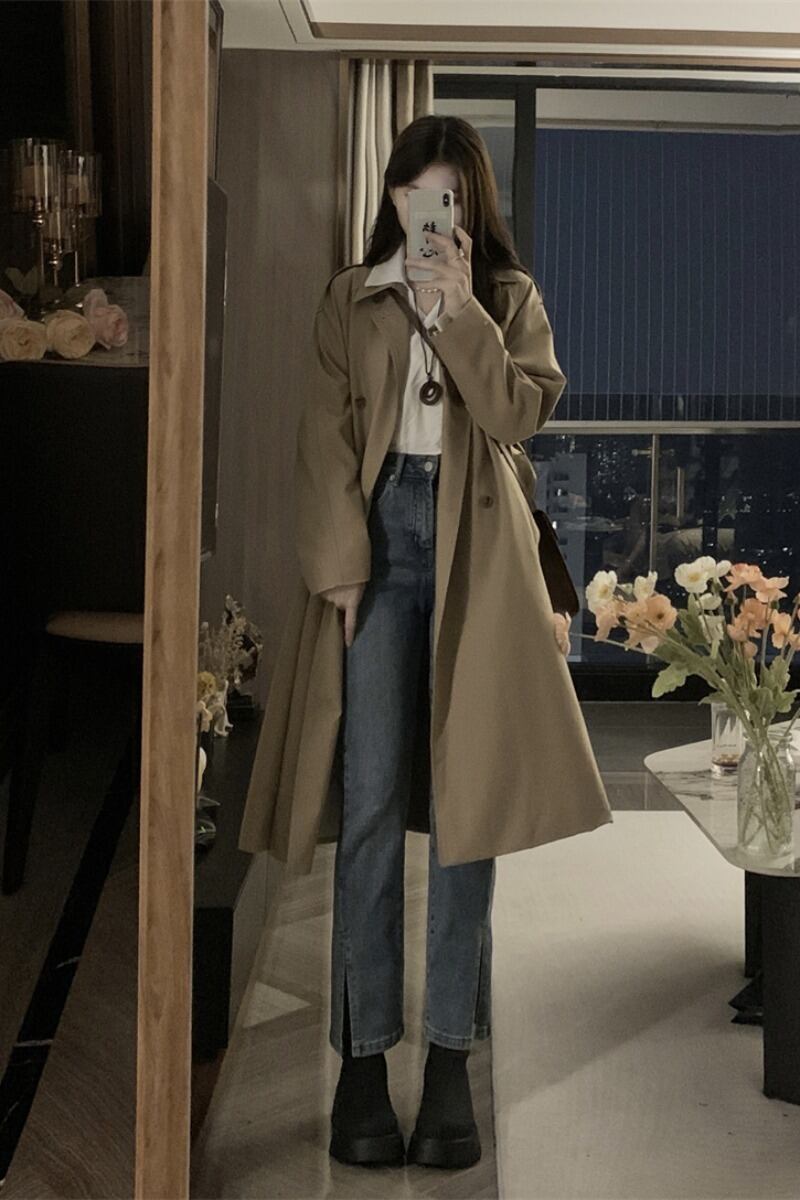 フレンチレトロカーキ長袖トレンチコート秋ルーズフィットトレンチコートミッドレングストップ Colthing ロング オータム 秋物
