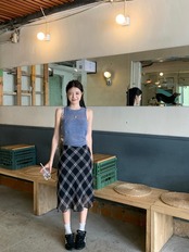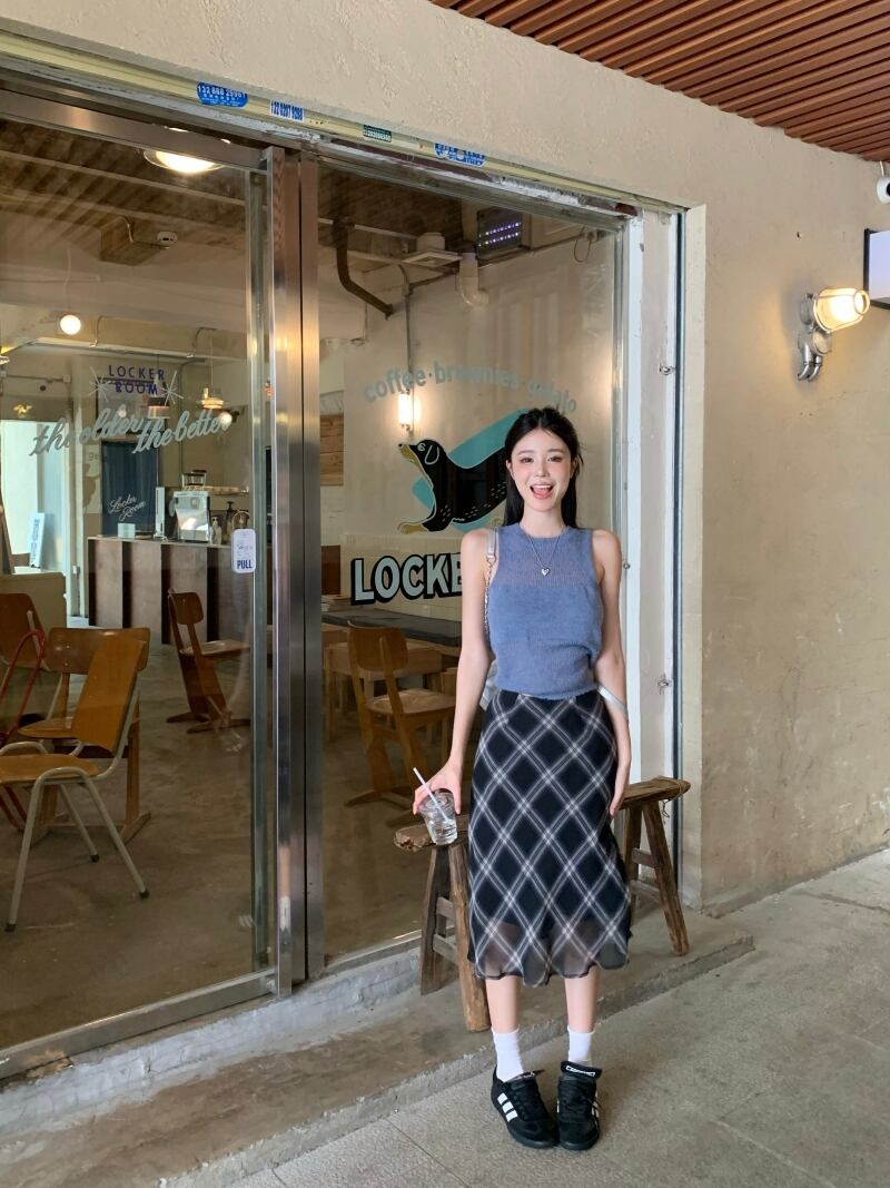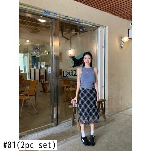 甘いホットガールスーツ夏ニットタンクトップコントラストストライプチェック柄ミッドレングススカートツーピースセット服 大人ガーリー スウィート キュート カジュアル サマー 夏物
