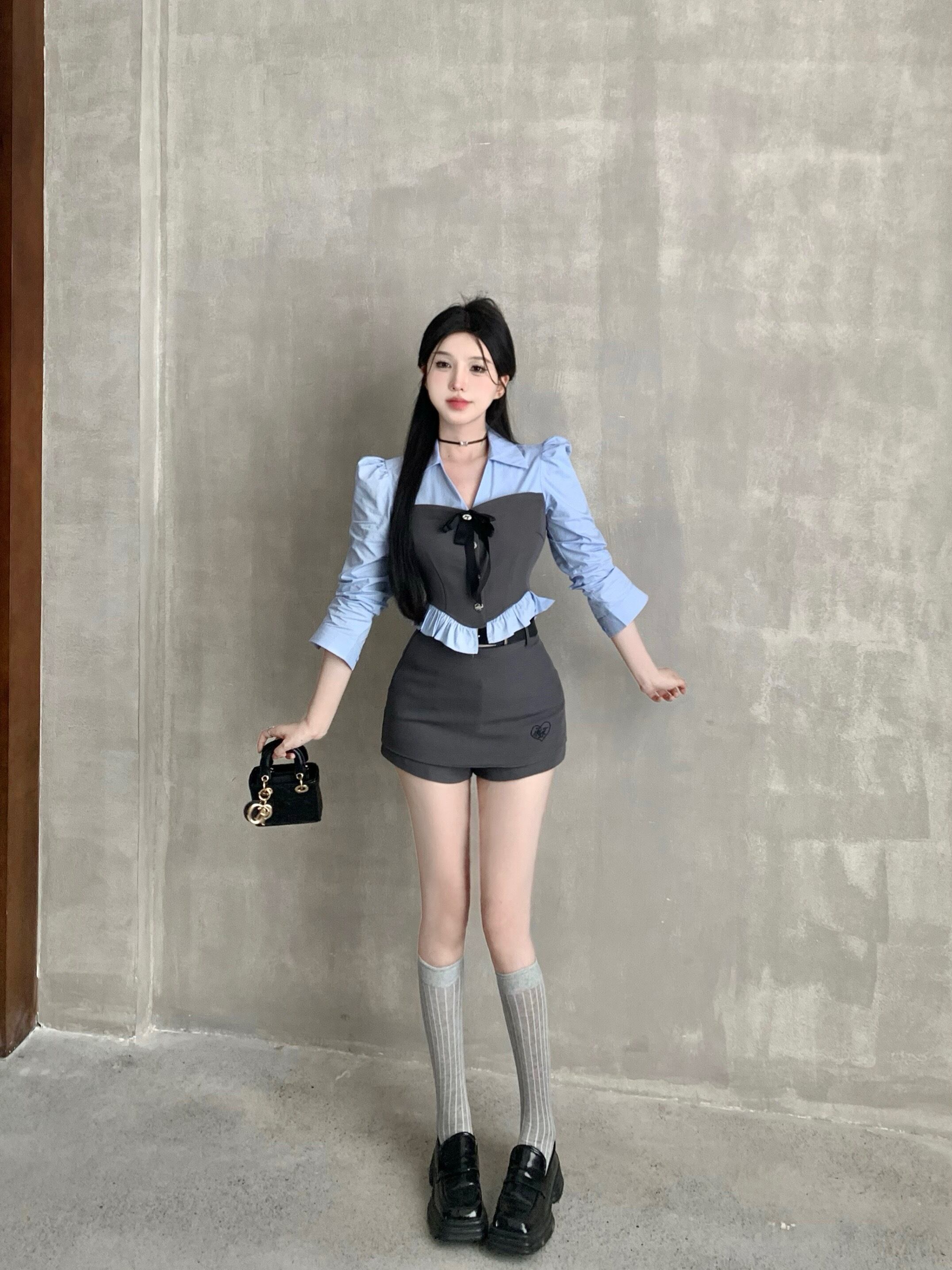 ホットガールスタイルスーツ秋バブルスリーブボウスプライスシャツウエストミニスカートツーピースセット服 リボン オータム 秋物