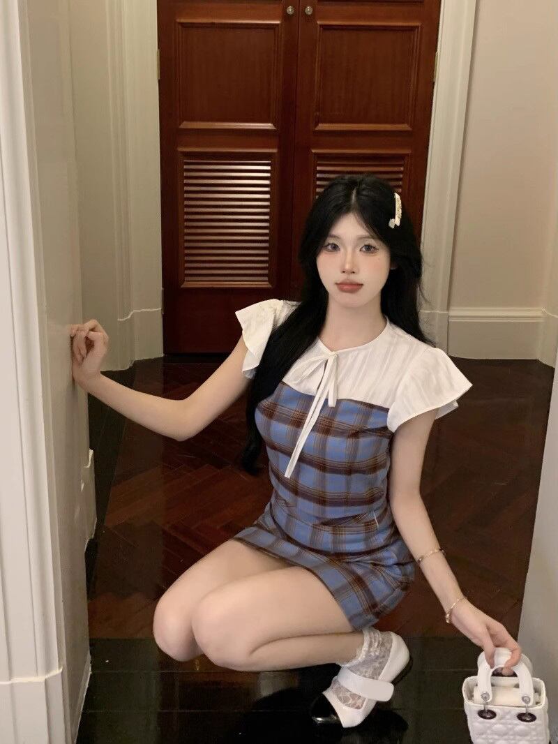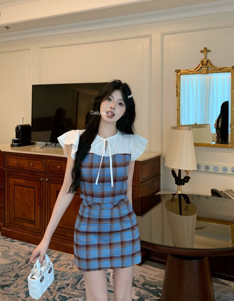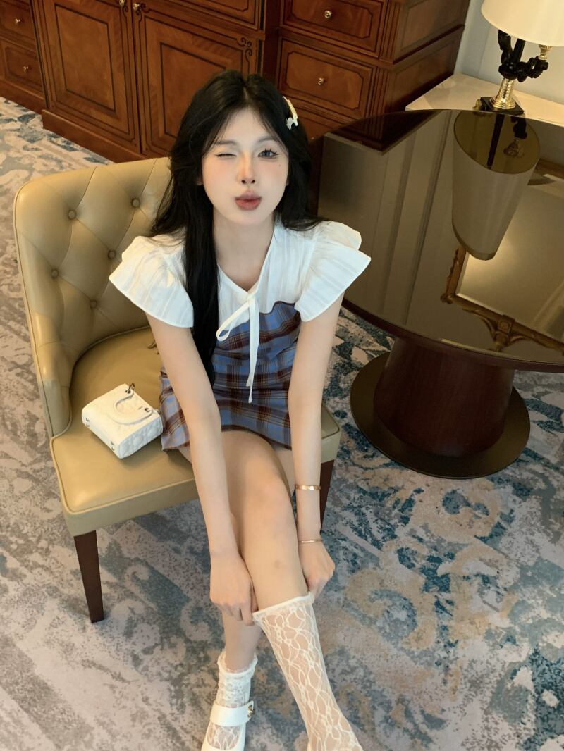 スウィートガールチェック柄セット夏フライングスリーブスプライストップラップヒップミニスカートツーピースセット服 大人ガーリー キュート カジュアル サマー 夏物