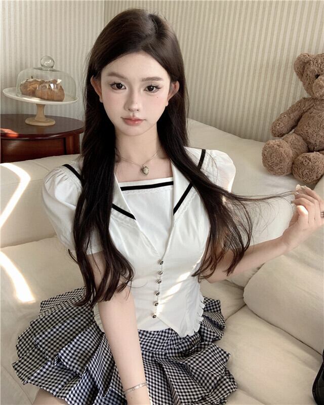 プレッピースタイルスーツ夏セーラーカラーシャツウエストプリーツ A ラインスカート 2 点セット服 サマー 夏物 Aライン