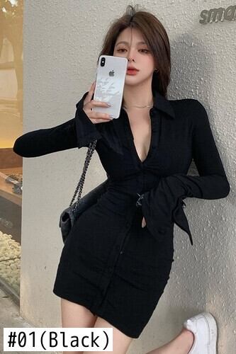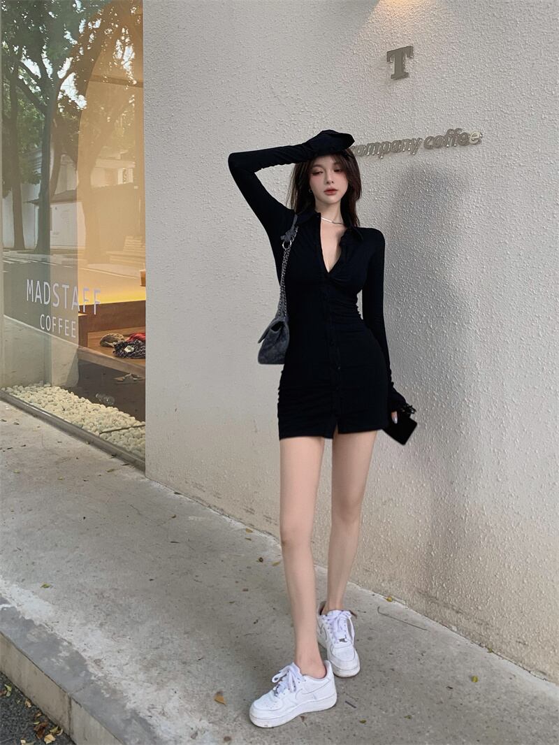 秋ドレス ミッドレングス ウエストスタイル スリム シングルブレスト ポロカラー フレアスリーブ 万能カーディガンドレス オータム 秋物