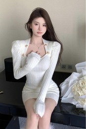 フレンチスタイルセクシードレス秋スクエアカラー下敷きラップヒップボトムニットショートドレス服 オータム 秋物 スクウェア