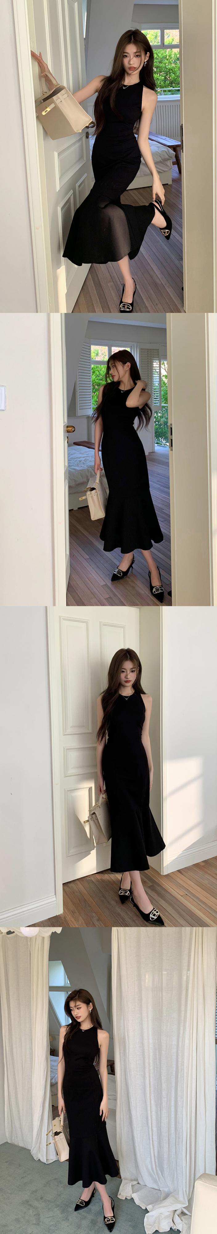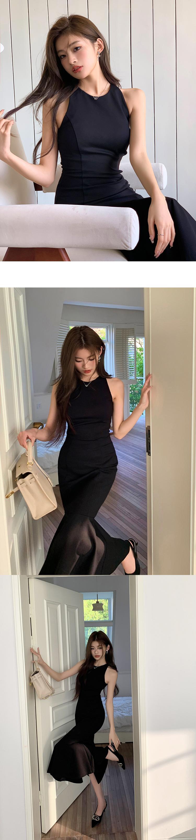 甘いホットガールノースリーブマーメイドラップ尻ドレス春/夏ラウンドネックスリムフィットドレス服 大人ガーリー スウィート キュート カジュアル スプリング 春物 サマー 夏物 Oネック