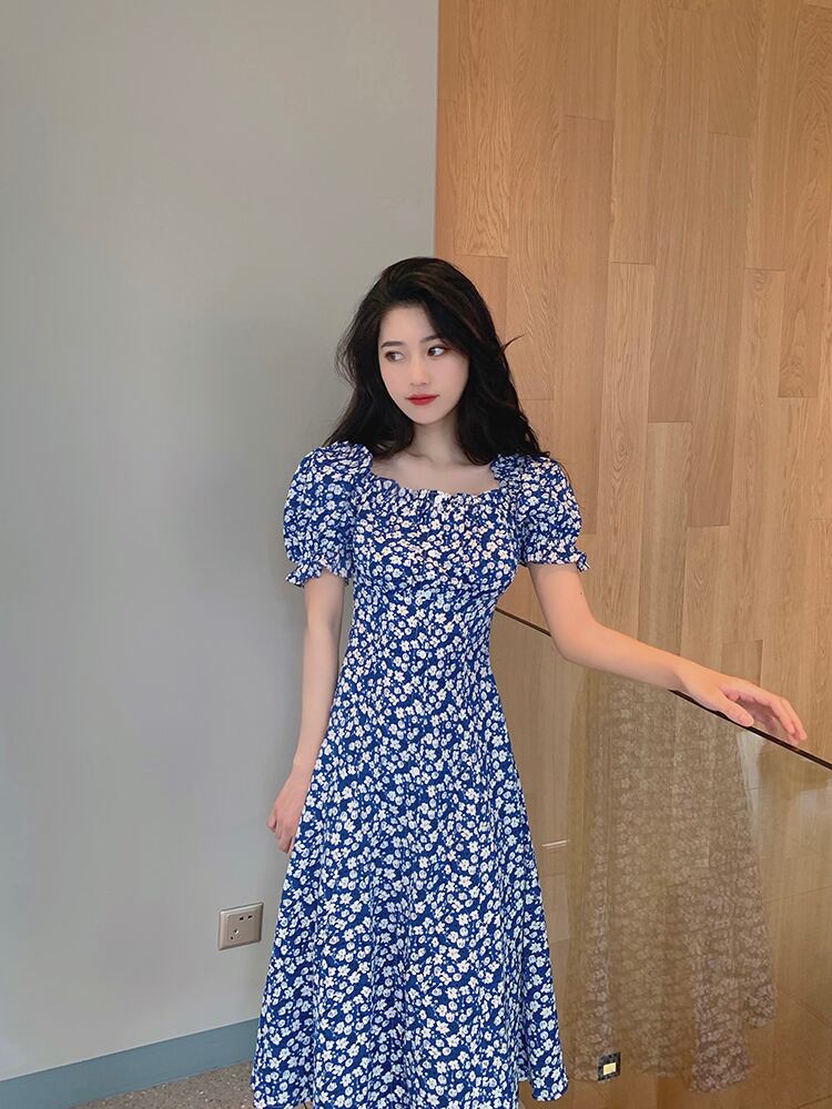 フレンチスタイル甘いホットガールロングドレス夏バブルスリーブドレスブルーフラワードレス服 大人ガーリー スウィート キュート カジュアル サマー 夏物 フラワーデザイン