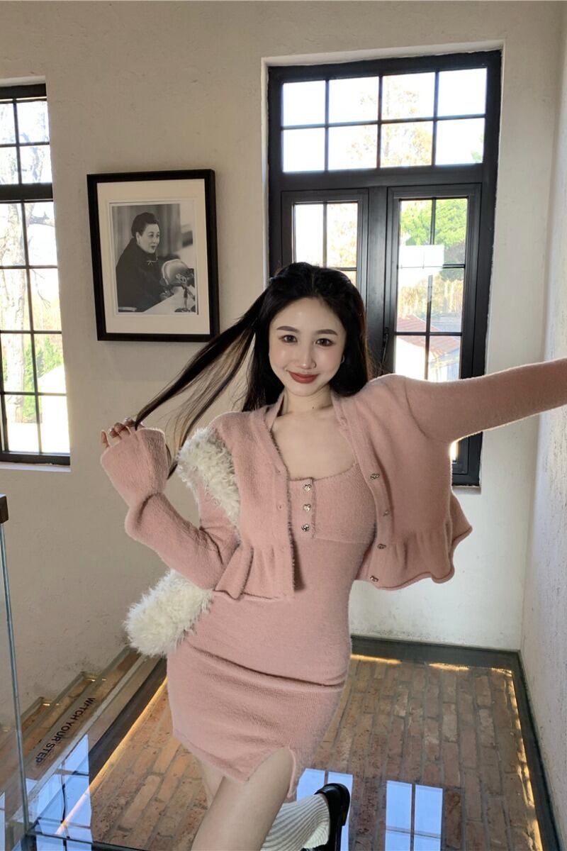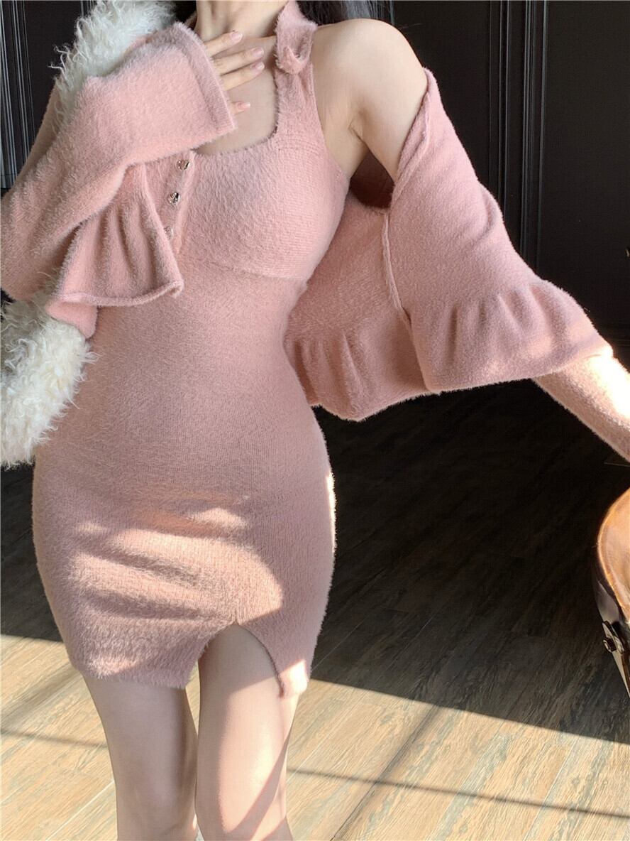 スイートガールスーツ秋/冬イミテーションミンクヘアスリムフィットドレス肥厚ぬいぐるみショートカーディガンツーピースセット 大人ガーリー スウィート キュート カジュアル オータム 秋物 ウィンター 冬物