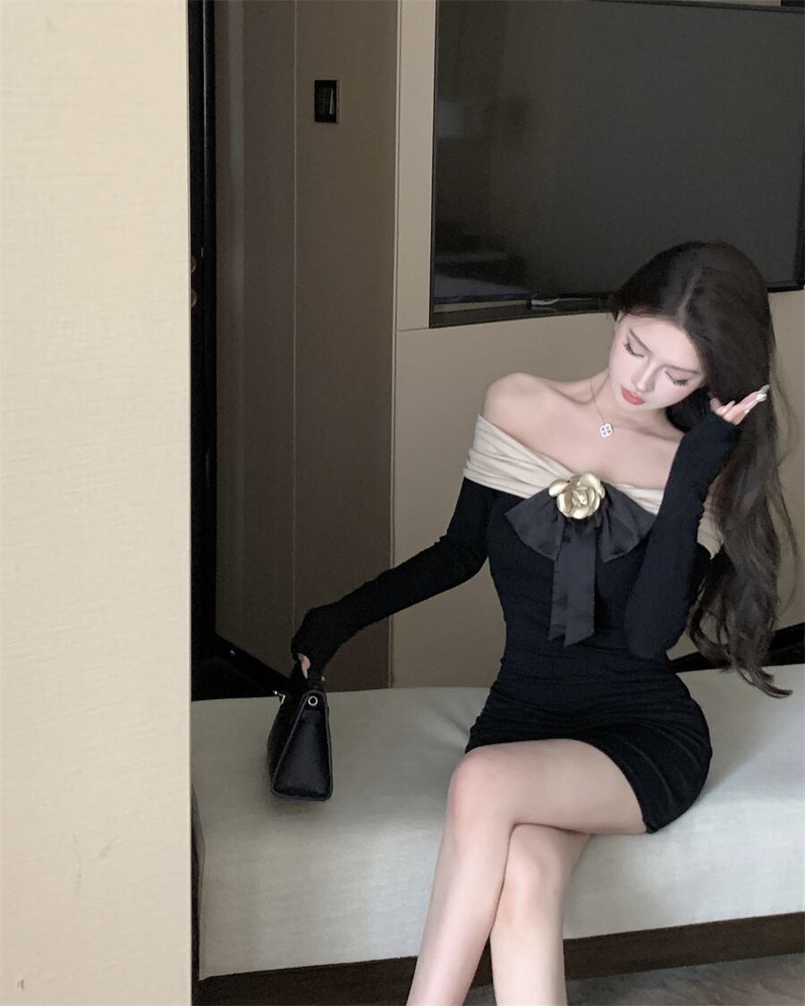 秋スタイルオフショルダー長袖ドレス椿コントラストウエストラップヒップグレードドレス服 ロング オータム 秋物