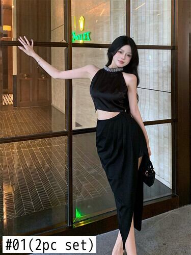 フレンチホットガールスーツ夏ノースリーブホルターネックオフショルダービーズトップヒップラップロングスカート2点セット サマー 夏物