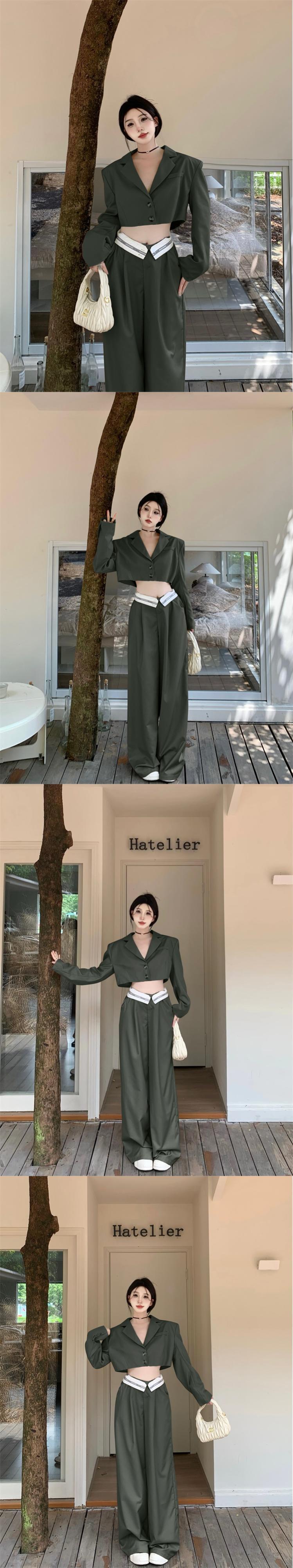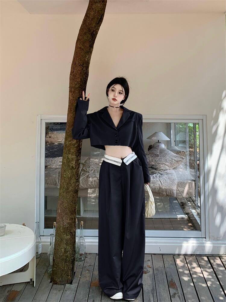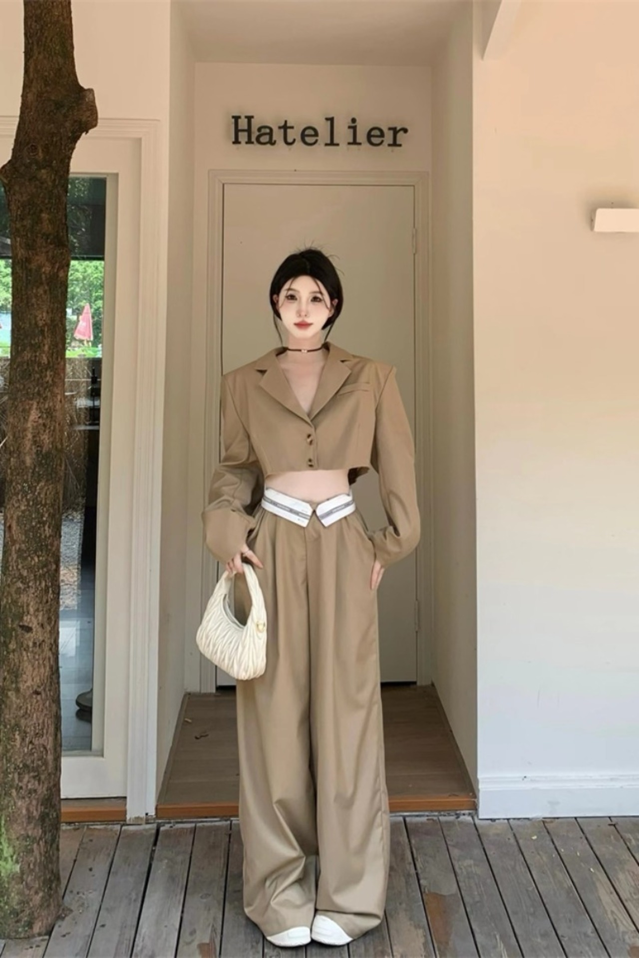 ホットガールスーツ夏ブレザーショートコートルーズコントラスト袖口ワイドレッグパンツツーピースセット服 サマー 夏物 ワイドパンツ