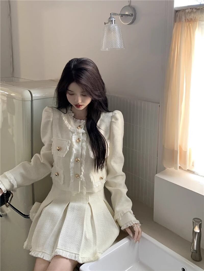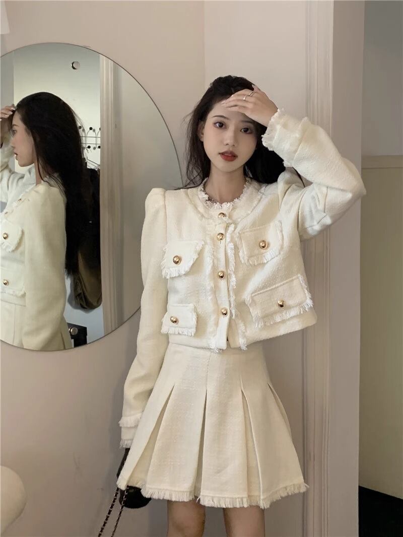 スタイルスーツ レディース 春秋 長袖 ラウンドネック コート ウエスト Aライン プリーツスカート 2点セット ロング スプリング 春物 オータム 秋物 Oネック