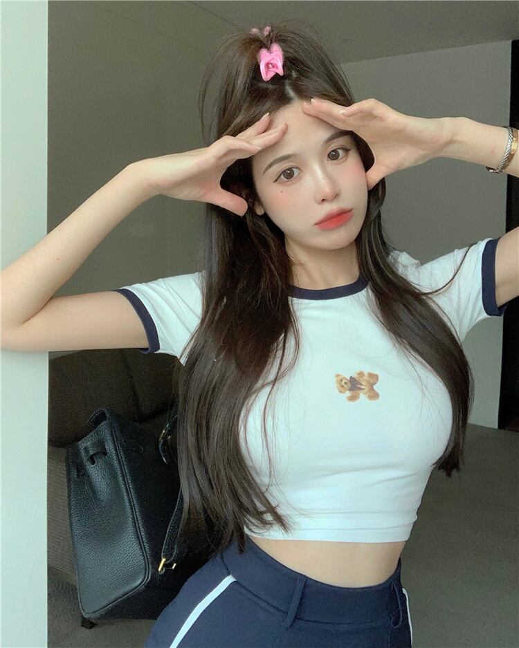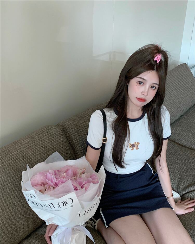 ホットガール純粋セクシースーツ夏スリムフィットリトルベアプリント Tシャツコントラストストライプウエストミニスカート 2 点セット サマー 夏物 ピュア