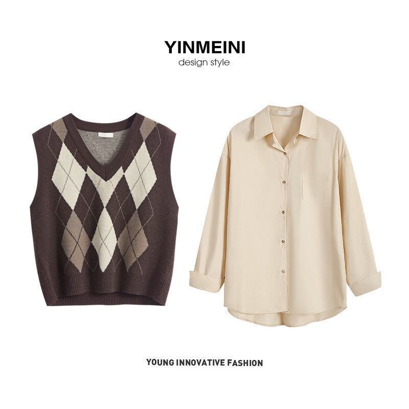 アカデミー スタイル スーツ レディース 秋 Lingge ニット ベスト シャツ ロング プリーツ スカート 3 点セット服 オータム 秋物