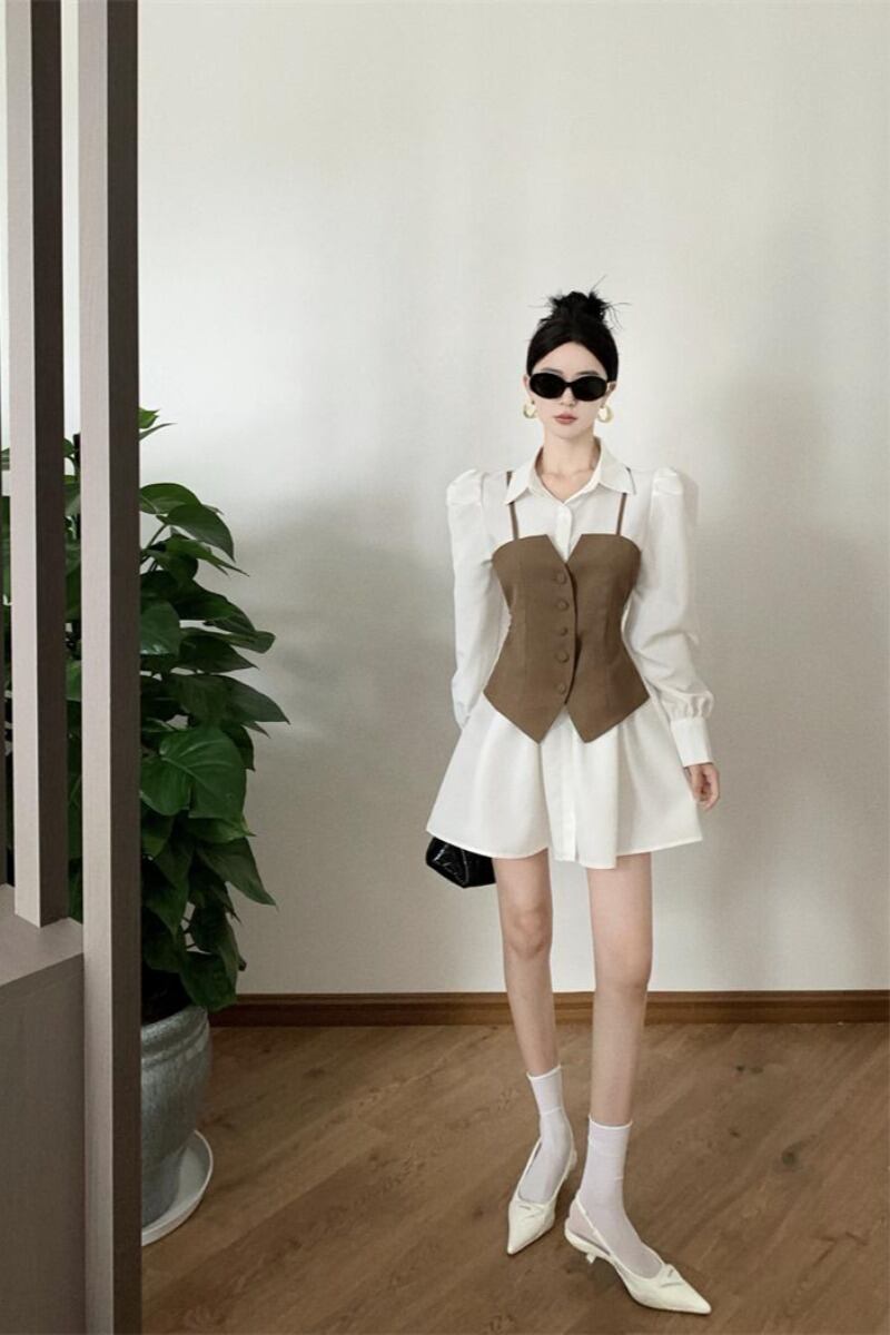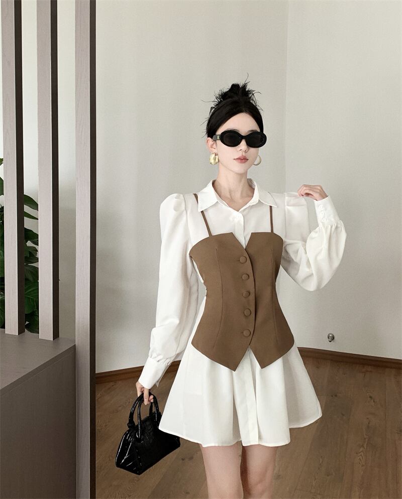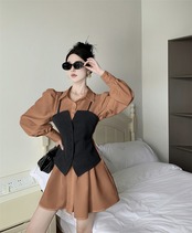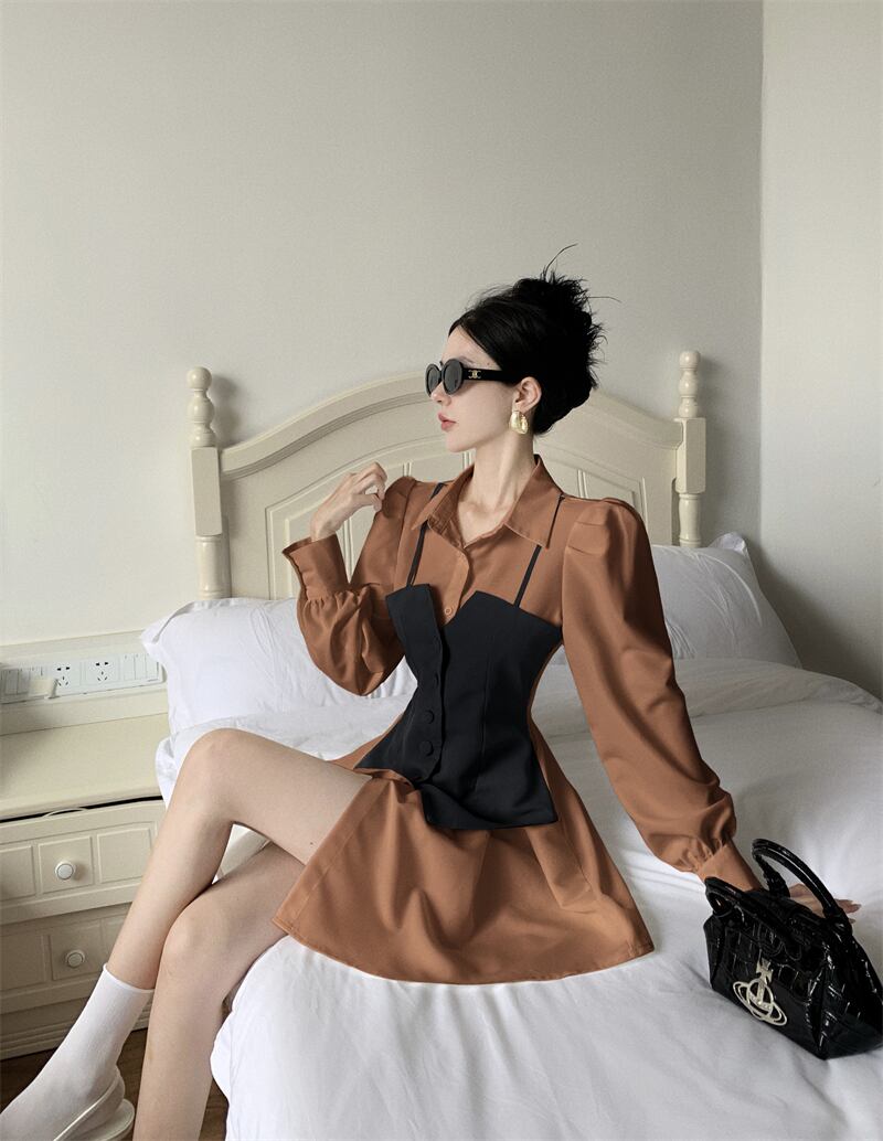 スタイルターンダウンカラースプライシングストラップフェイクツーピースドレス秋スリムフィット長袖ドレス ロング オータム 秋物