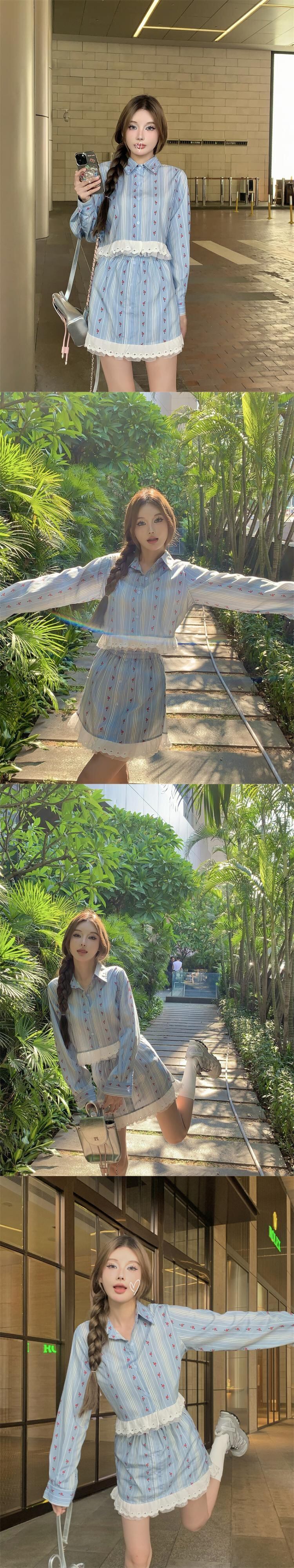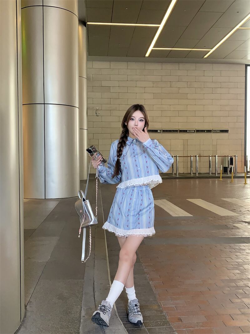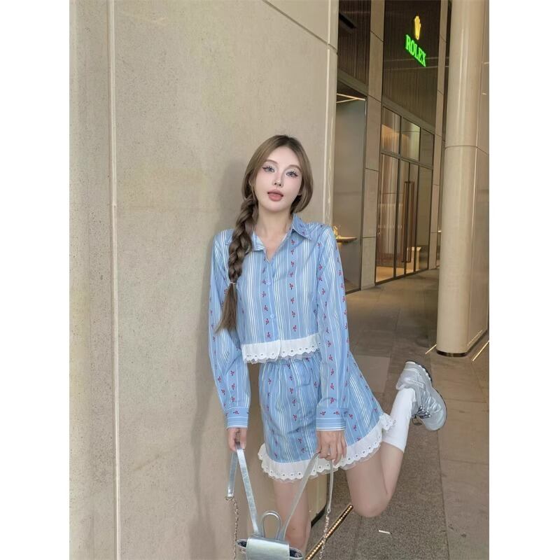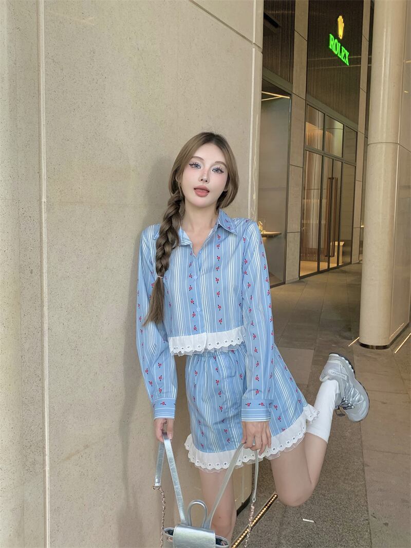 甘いホットガールスーツ夏長袖花柄トップレースウエストミニスカートツーピースセット服 ロング 大人ガーリー スウィート キュート カジュアル サマー 夏物