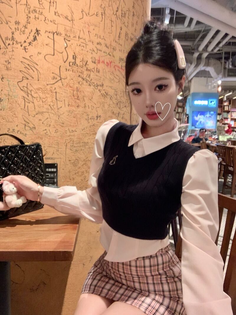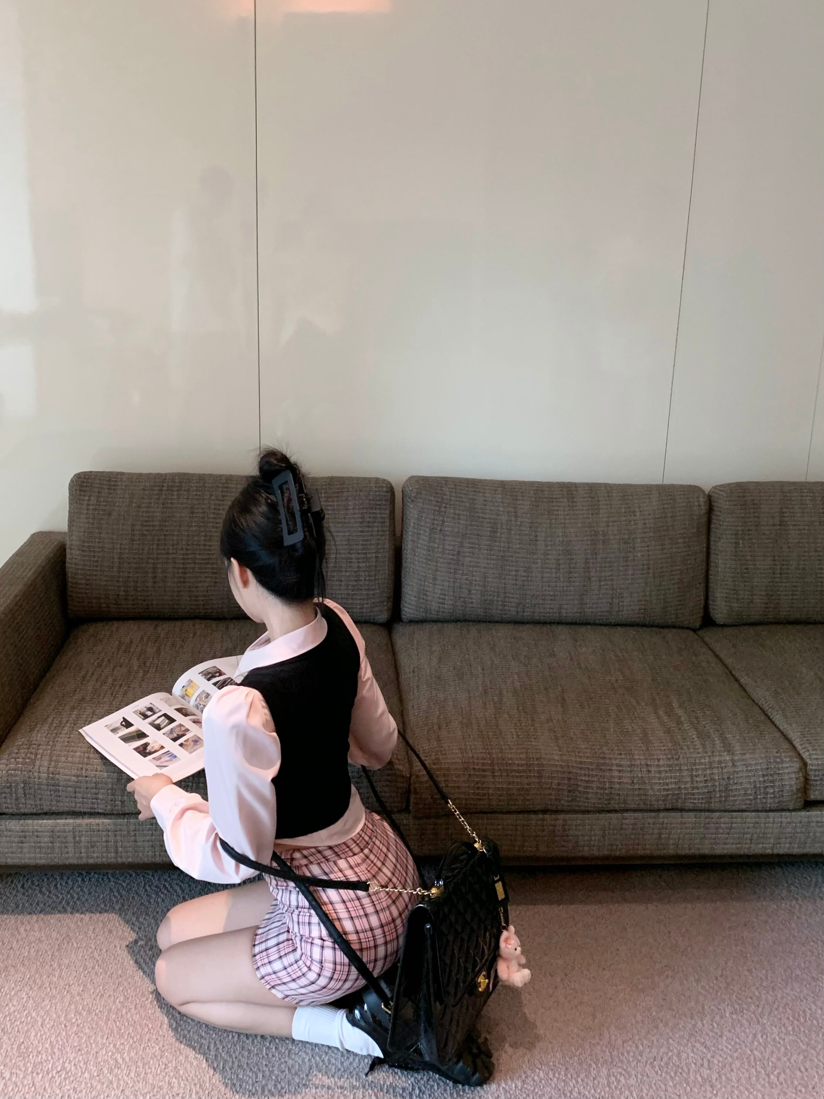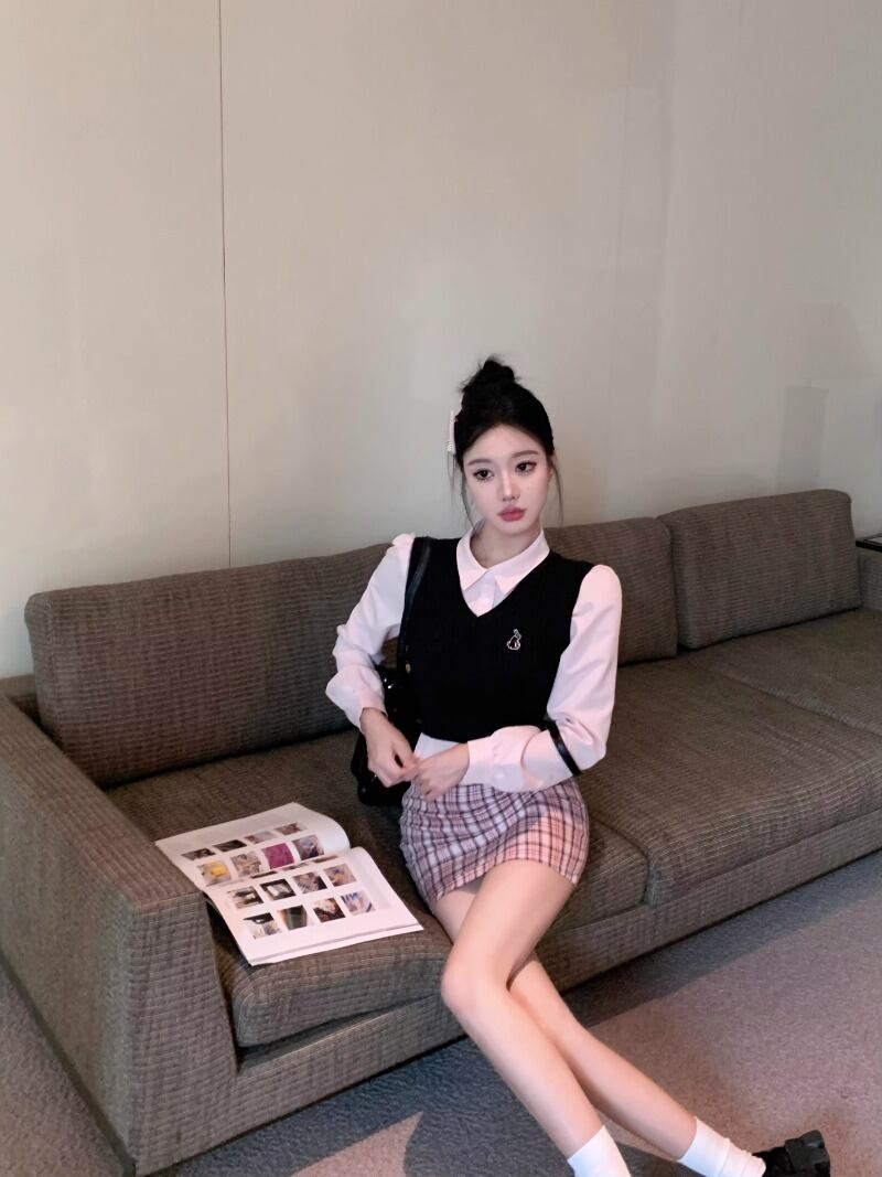 プレッピースタイルスーツ秋ニット V ネックタンクトップピンクシャツチェック柄スカート 3 点セット服 オータム 秋物 Vネック