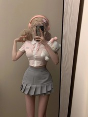Gothiscyn 夏スタイル ピンク ポロネック シャツ グレー ウエスト プリーツ スカート アカデミー スタイル セット レディース サマー 夏物