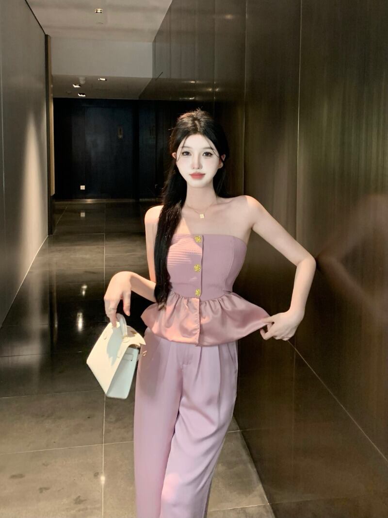 スイートホットガールスーツ夏ストラップレスフリルトップウエストワイドレッグロングパンツツーピースセット服 大人ガーリー スウィート キュート カジュアル サマー 夏物 ワイドパンツ
