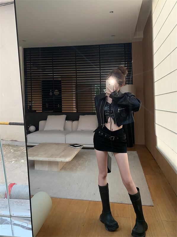 甘くてホットガールレトロスーツ秋レザーコートセクシー背中開いたホルターネックタンクトップラップヒップスカート 3 点セット 大人ガーリー スウィート キュート カジュアル オータム 秋物